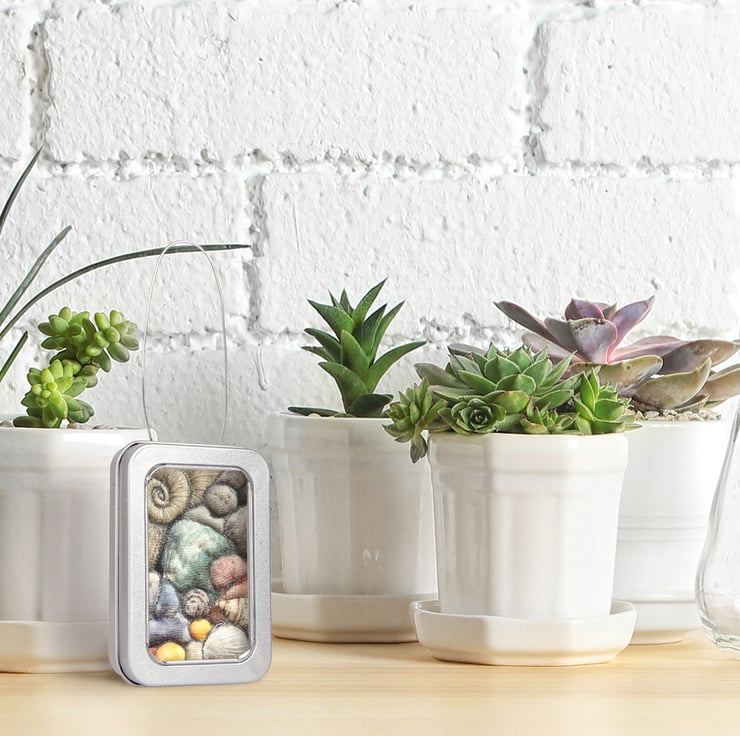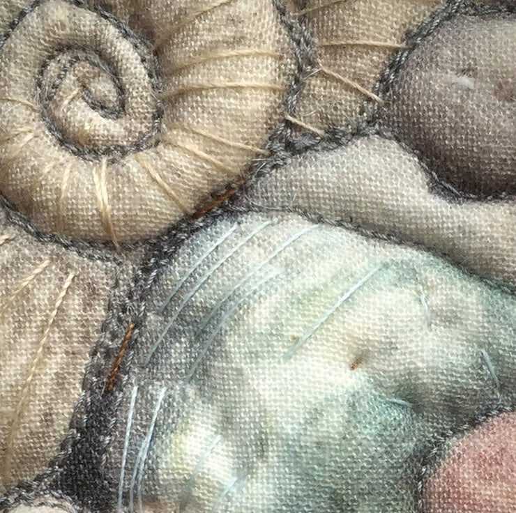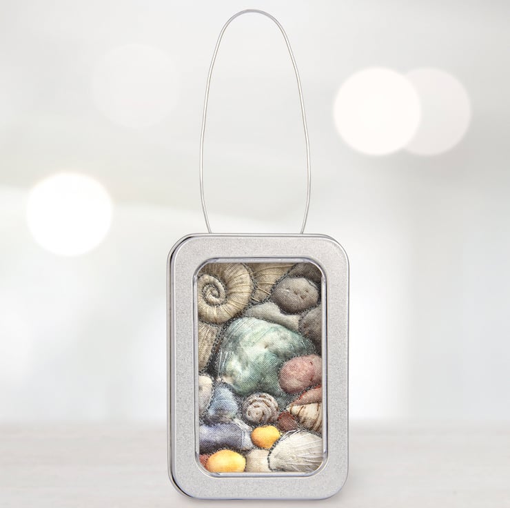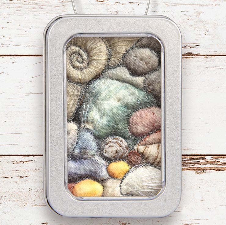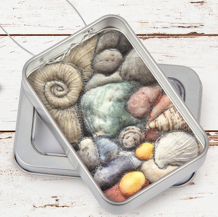 Beach, hand embellished, textile print - stitched and framed in a tin, with a loop to hang it up