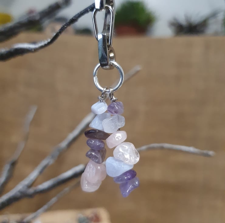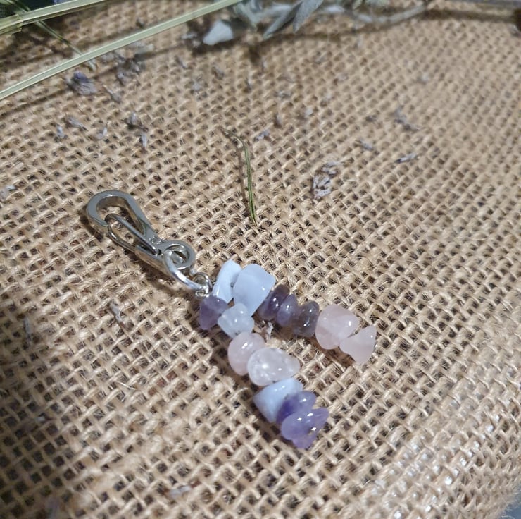 Three carefully selected crystals, rose quartz, blue lace agate and amethyst, make up this calming collar charm.