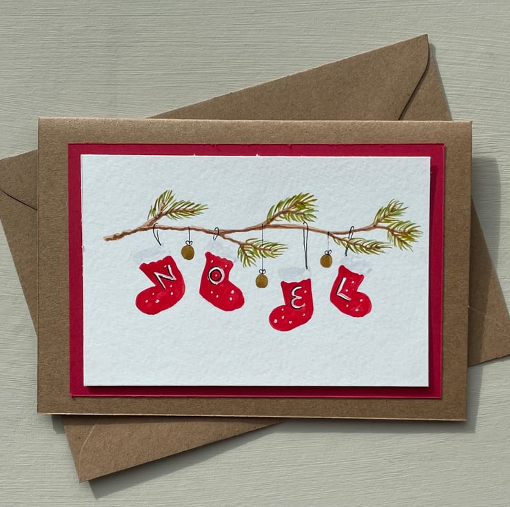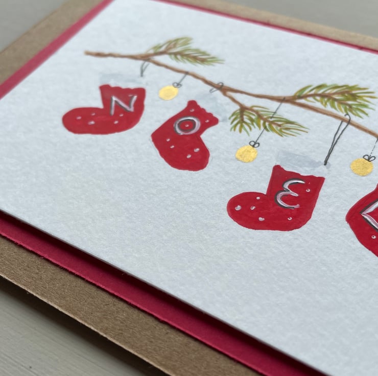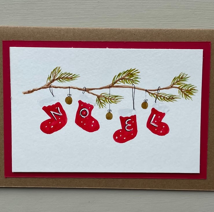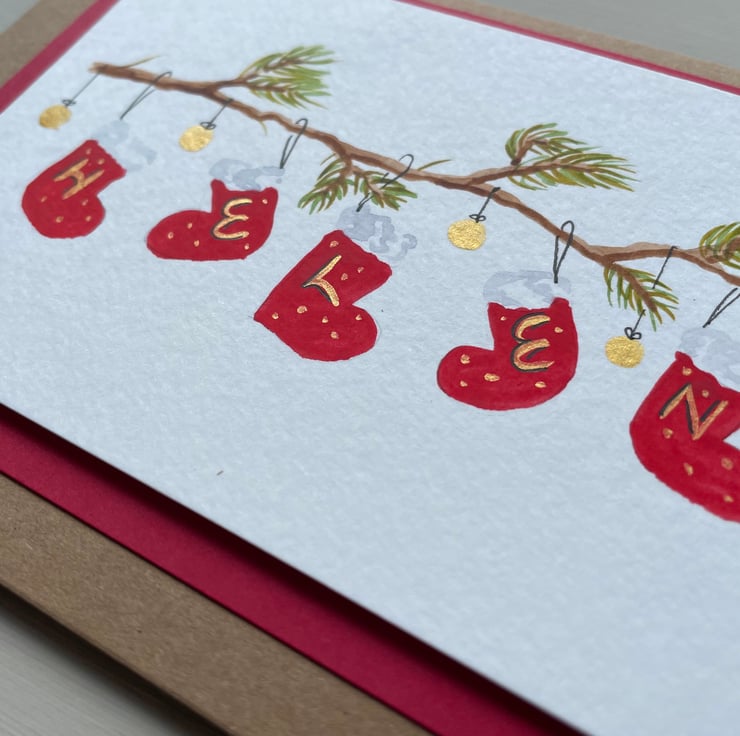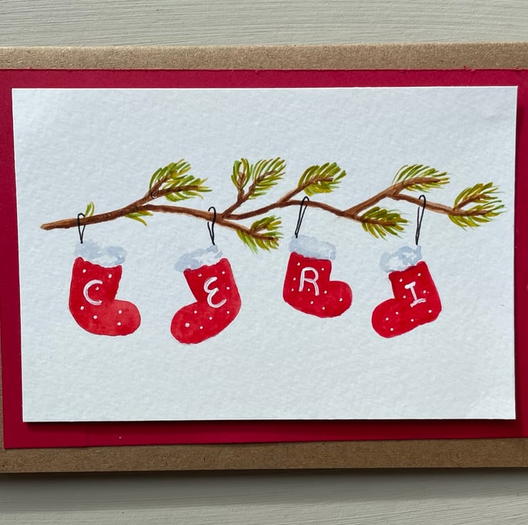This Christmas card features little red Christmas stockings hanging on a fir tree branch, along with small shiny gold baubles to add a bit of sparkle, I can personalise with up to 6 letters of your choice, in white acrylic paint or I can use gold or silver paint if you prefer.