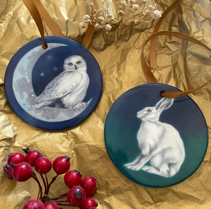 I love Christmas Tree decorations and never seem to be able to stop collecting them! So I decided to make a few of my own, by having some of my illustrations printed onto ceramic hanging ornaments - I am so pleased with the results! Please note, that it is not just for Christmas at all - people are decorating their houses with these year round and they also make great Easter gifts/ decorations! This Hare is from my 'Woodland Spirit Animals' wrapping paper and greeting card, which you can find elsewhere in my shop.