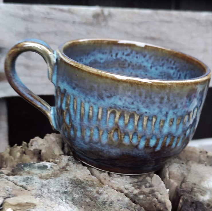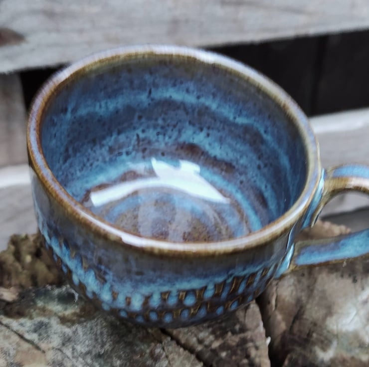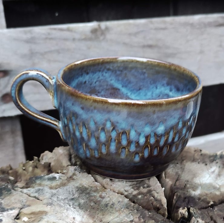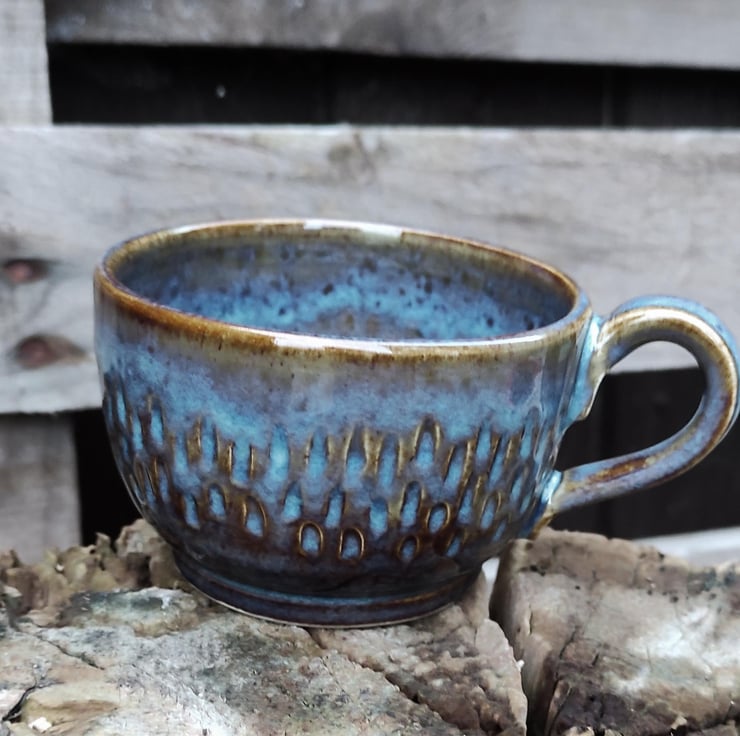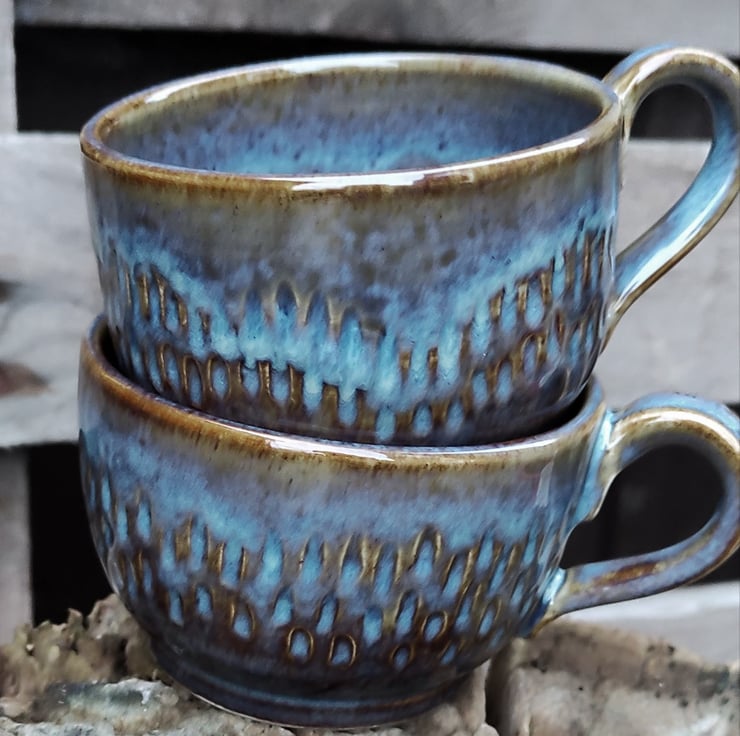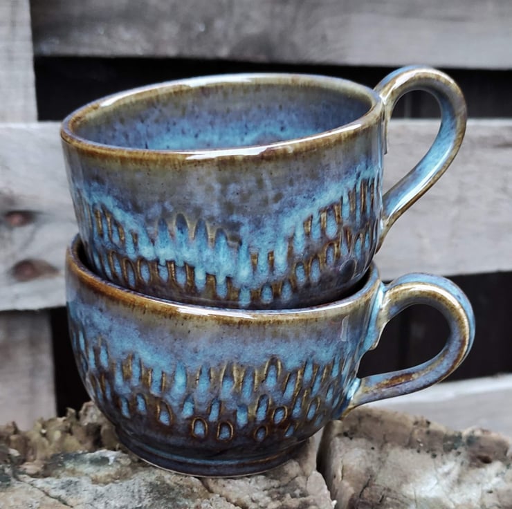 These are low coffee or tea cups (especially if you're using a teapot!)...another shape for my hedgehog design. One cup is slightly smaller than the other in height but fit together well. Fired to c1226 degrees (stoneware temperature) which makes the cup more durable.
