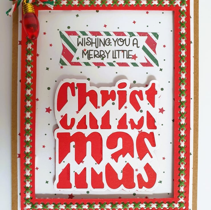 Different layers of quality card have been put together, to create the 2-part sentiment "Wishing You A Merry Little Christmas", surrounded by a cross stitched border in matching colours.
