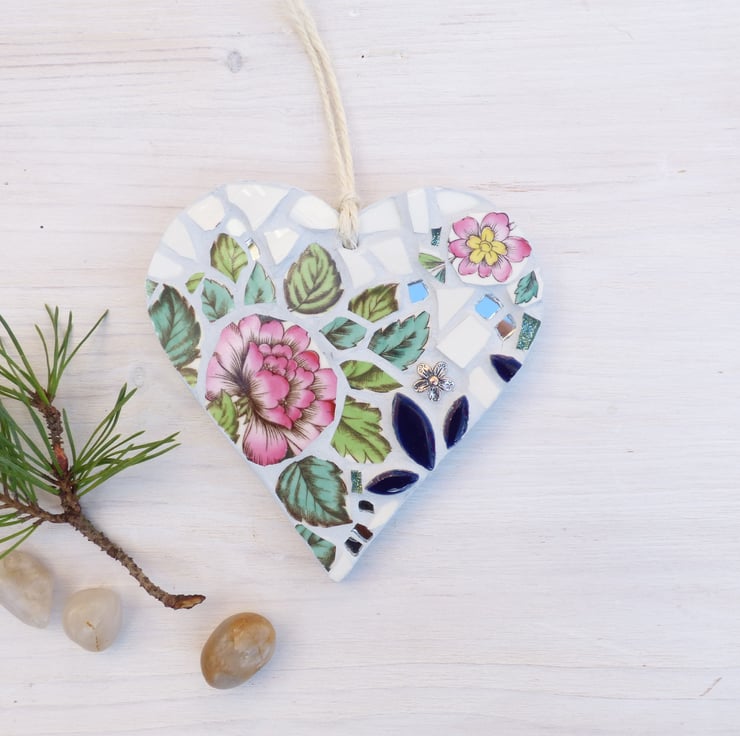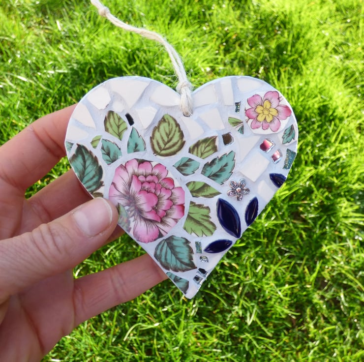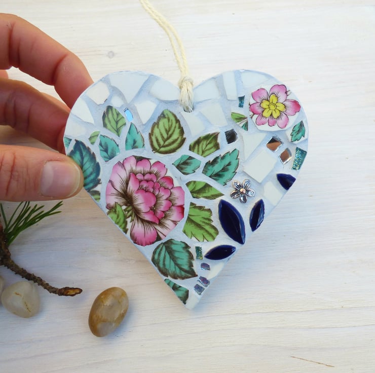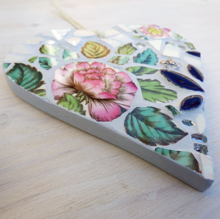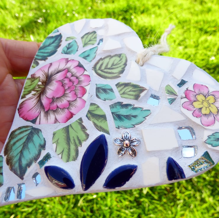 A delightful mosaic hanging heart decoration made from a flower and leaf pattern broken china plate that has been upcycled, repurposed and given a new lease of life! Little pieces of glittered tiles and mirror have been added to catch the light giving a lovely sparkle.
