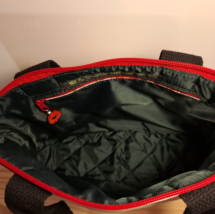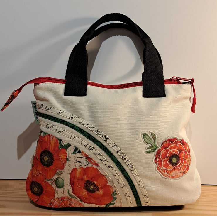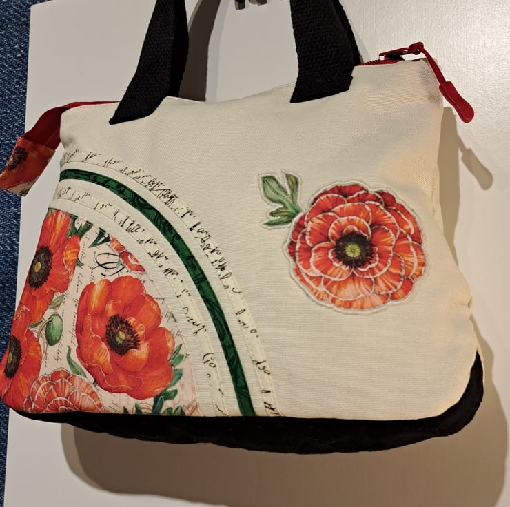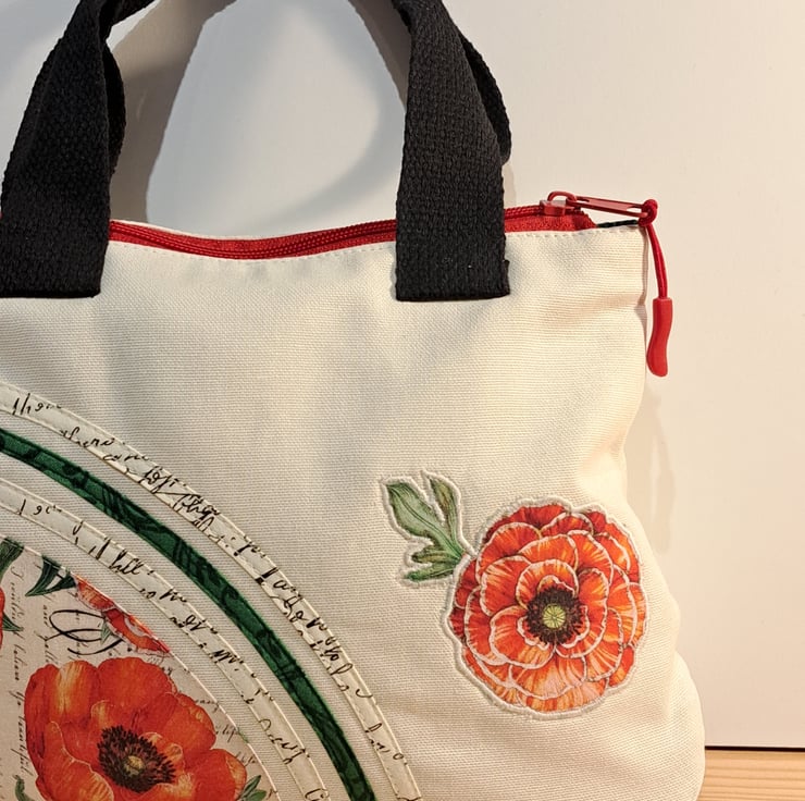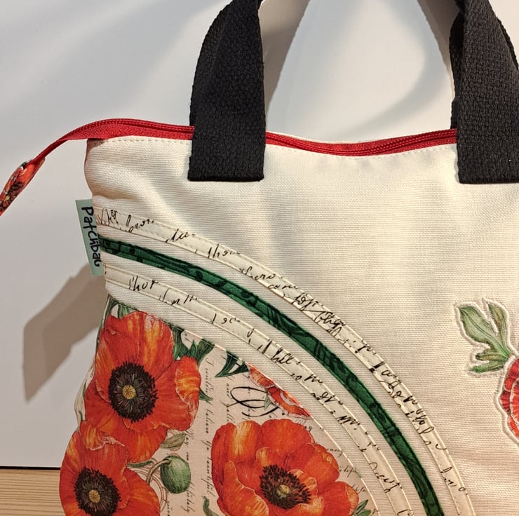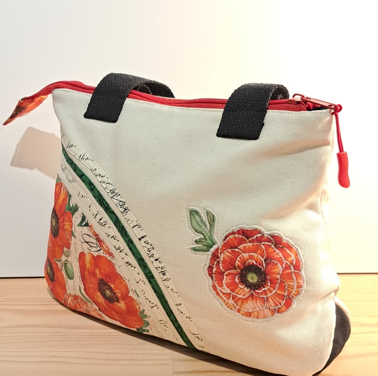 Handcrafted ivory handbag with poppy flowers and handwrited letters patterns. The bag made with patchwork and quilting techniques decorated with applique poppy flower. The bag made cotton canvas and cotton fabrics, the lining made from waterproof fabric, has inner pocket with zip closure. The handbag closing with zip on the top. The inner pocket has poppy flower charm on the zipper. Dimenions of the handbag: hight:20cm,width: 31cm, depth: 8.5 cm on the bottom of the bag.