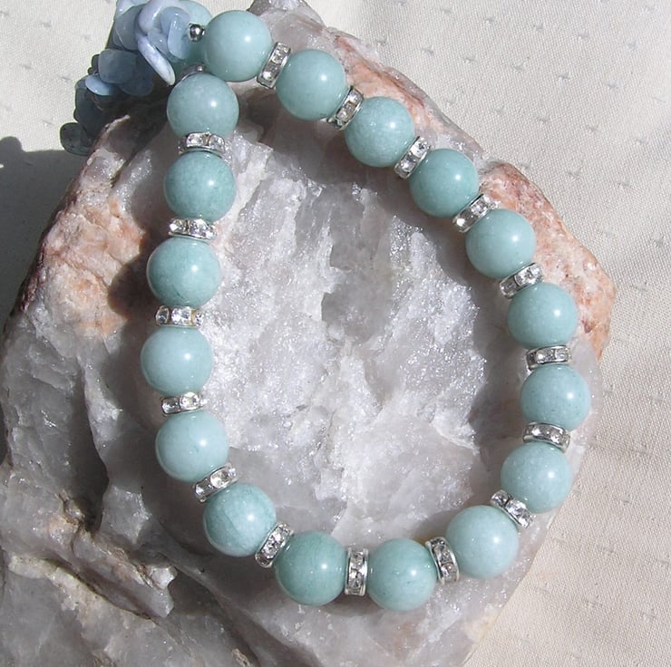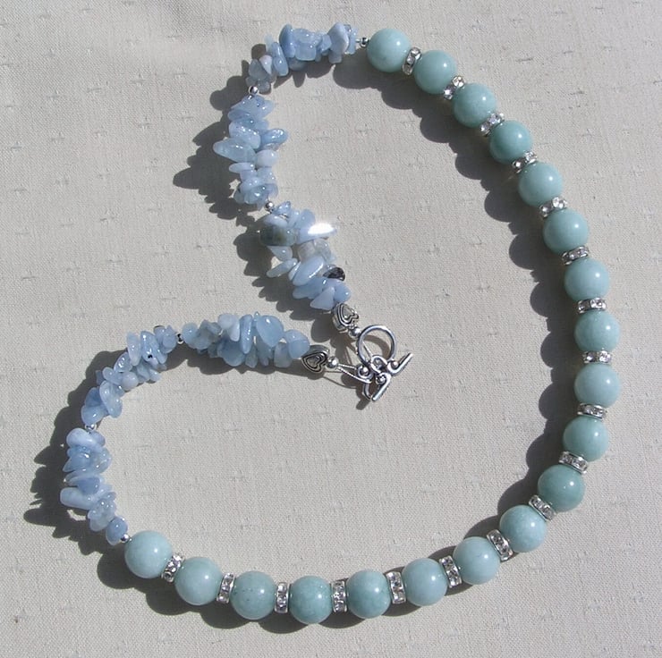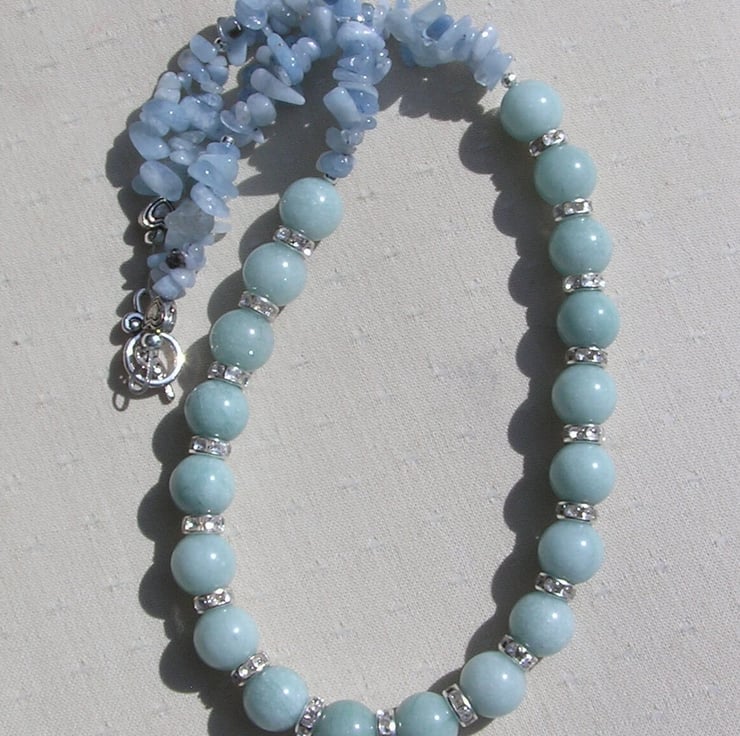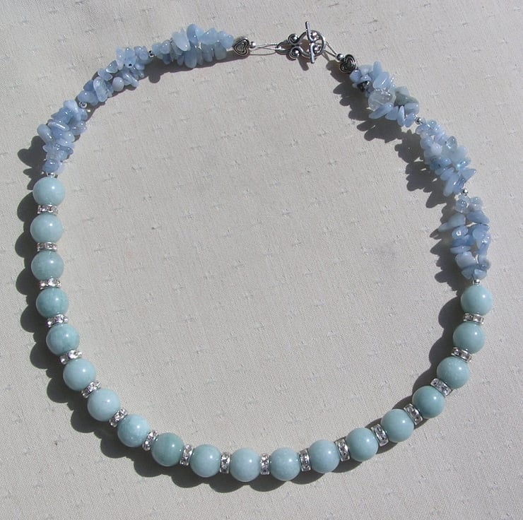 This Stunning Necklace is made wholly from Aquamarine - Chunky Round Beads alternated with Glistening Crystal studded spacers which then flow into double-stranded Aquamarine Gem chips - a Gorgeous soothing effect that will look stunning either worn casually or with something more Elegant for a Special Evening out