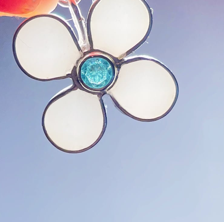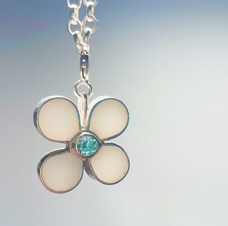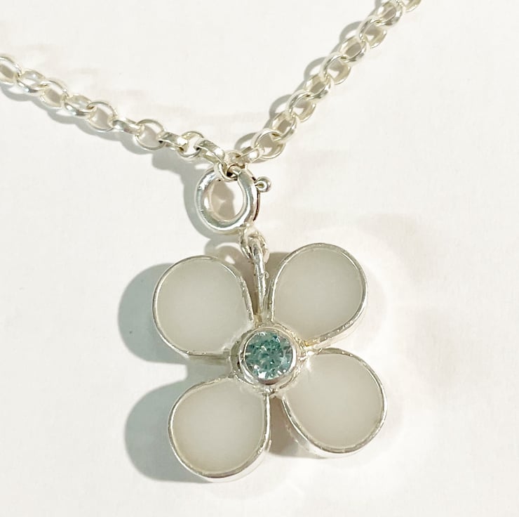 This piece is made using sterling silver and set with pale blue cubic zirconias, the flower petals are filled with translucent white resin and polished to a high shine.
