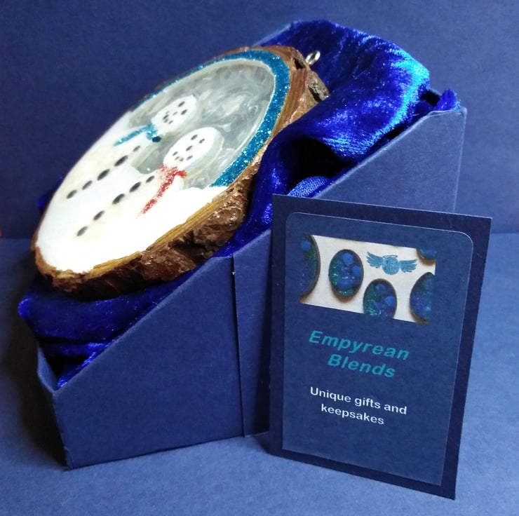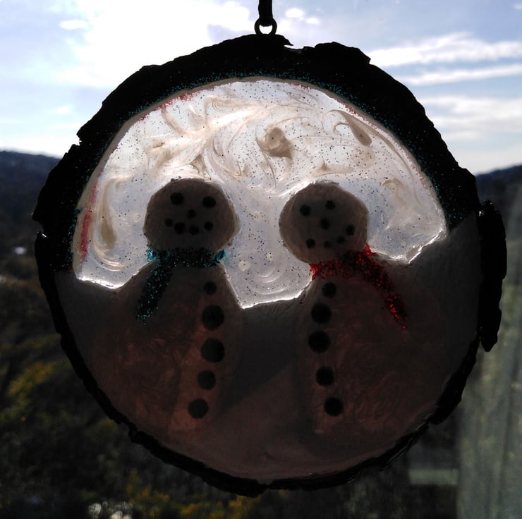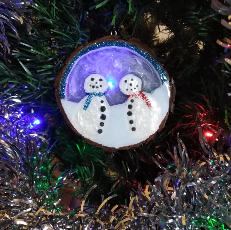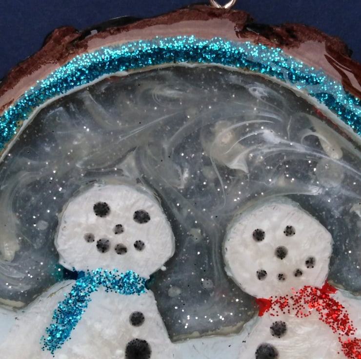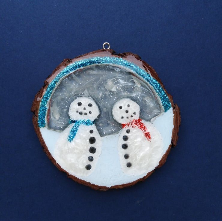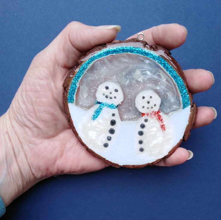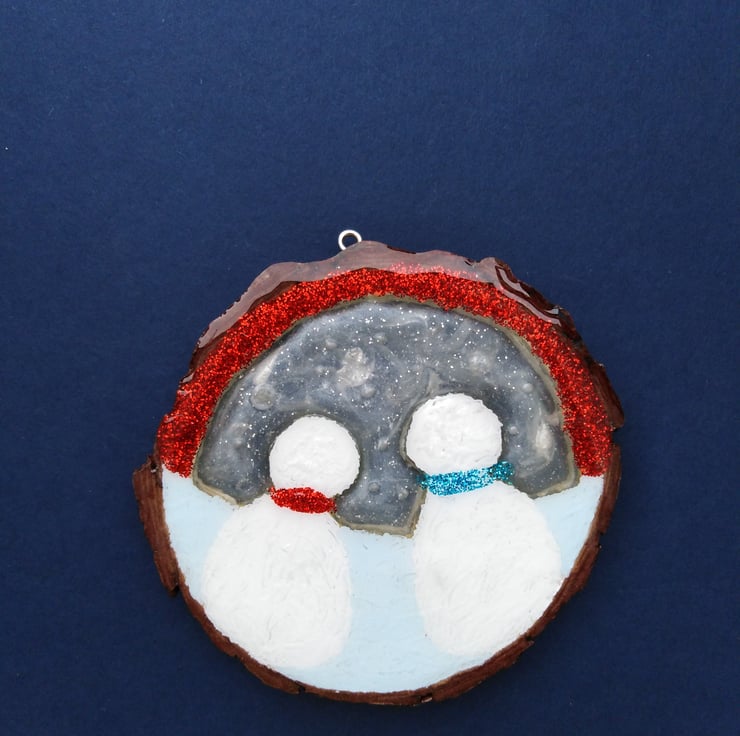 This one of a kind, totally unique piece is 10cm by 10cm and just over 1cm thick and made by cutting, sanding and shaping the snow people from a wooden slice, painted using titanium white acrylic paint, varnished and filled with super glossy, clear resin.