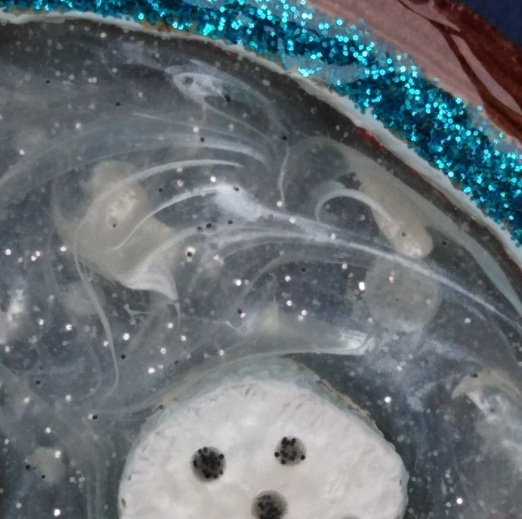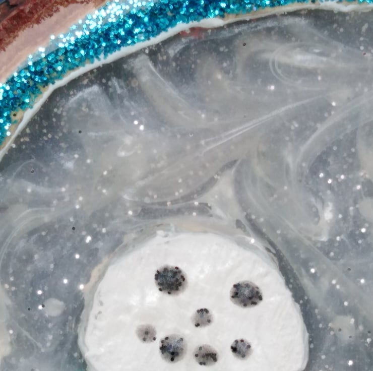 White swirls of resin are used for the snow storm swirling around them.