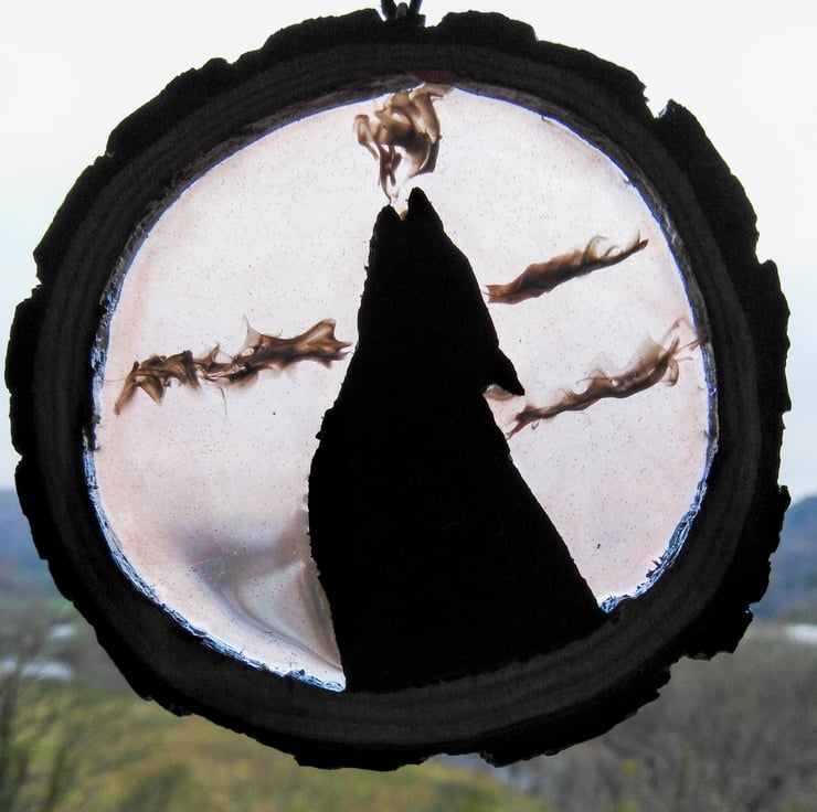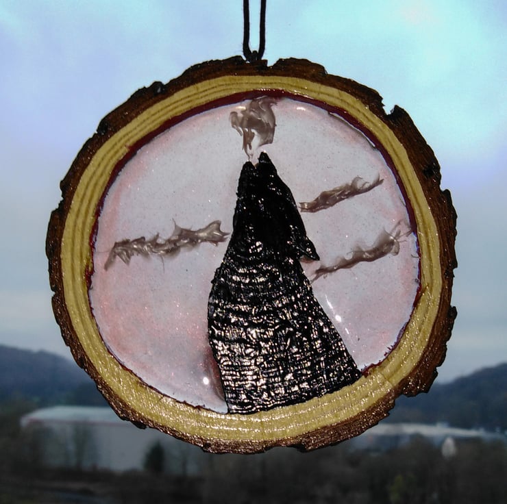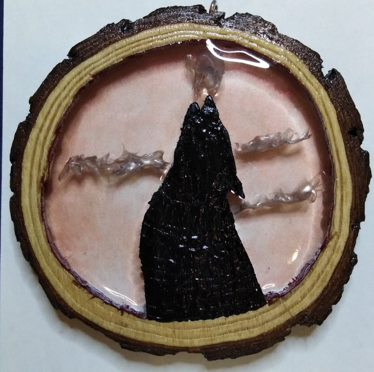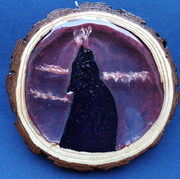 Blue wolf is carved and shaped from a wooden slice, sanded and painted with prusian blue acrylic paint to give it a lovely textured look and feel and varnished to protect the wood. The red moon has been created using crimson mica powder in resin to give a red hue and swirls of white resin for the wolfes breath and clouds.