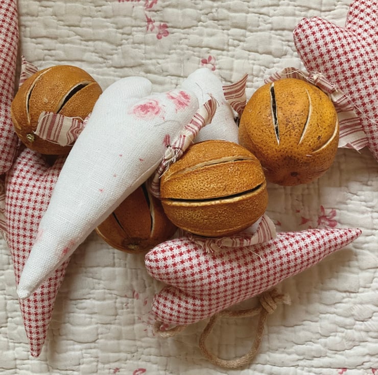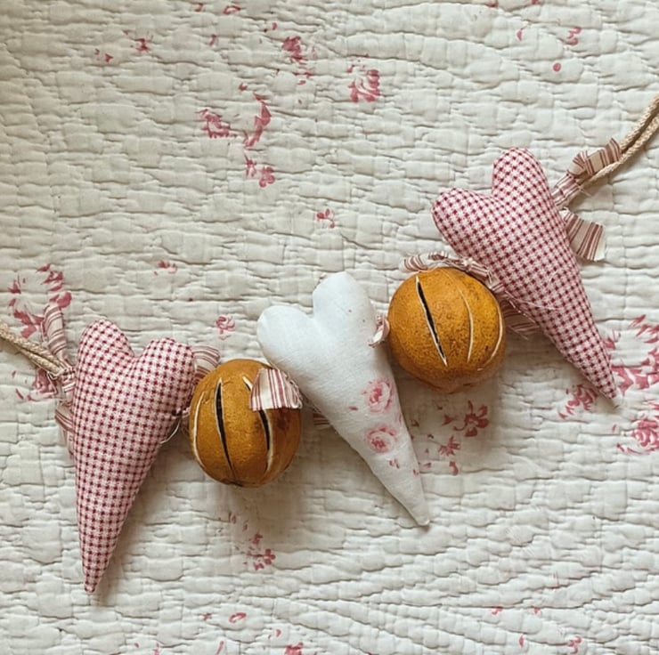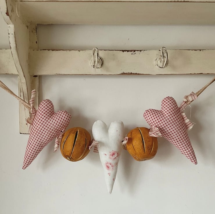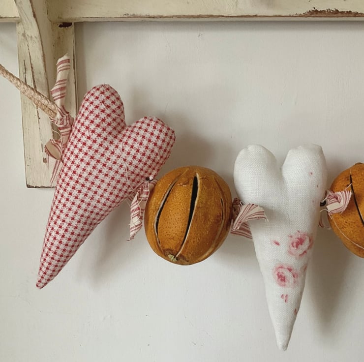 A gorgeous primitive style garland made from two whole dried oranges, and three vintage fabric hearts, interspersed with fabric ties.