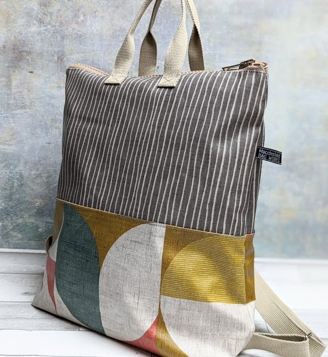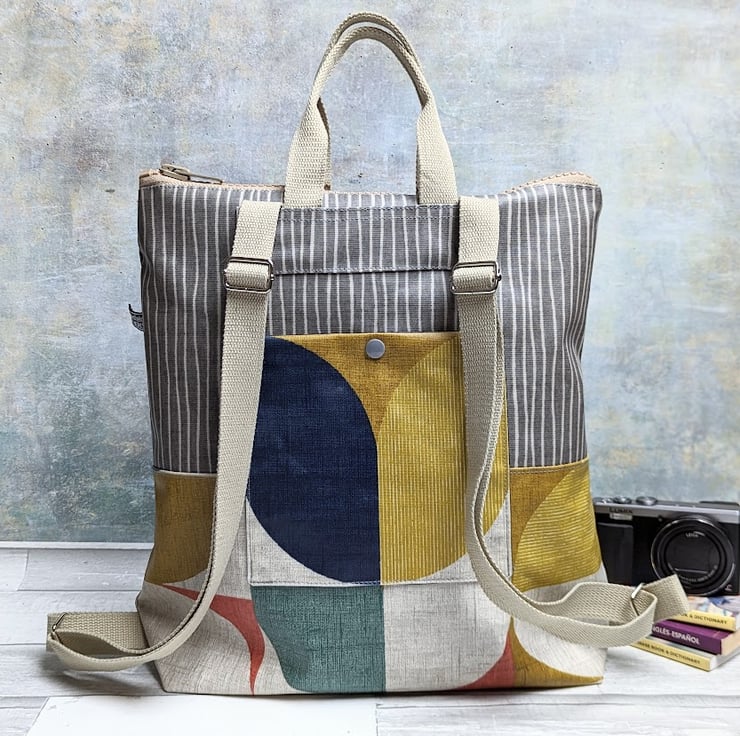 This geometric print and striped matt PVC coated cotton (oilcloth) backpack has a zipped top and is lined with a navy blue rip-stop nylon lining.