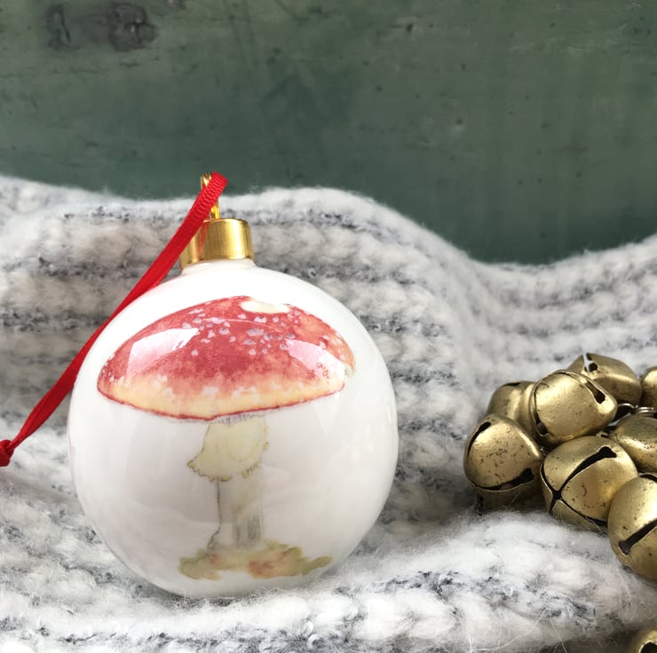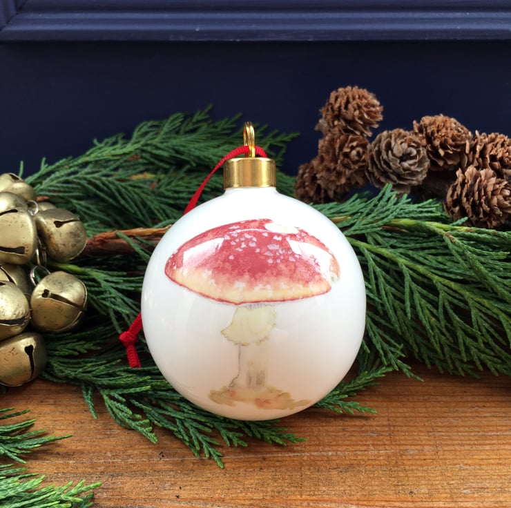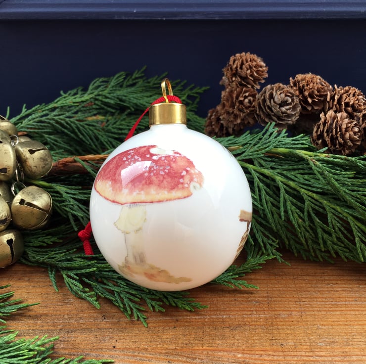 Hand decorated fine bone china Christmas bauble with toadstool illustration. A beautiful heirloom Christmas decoration.