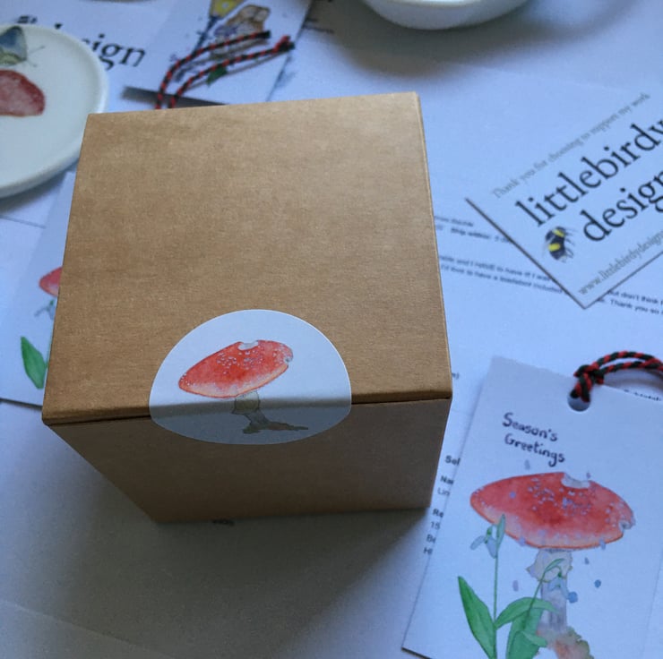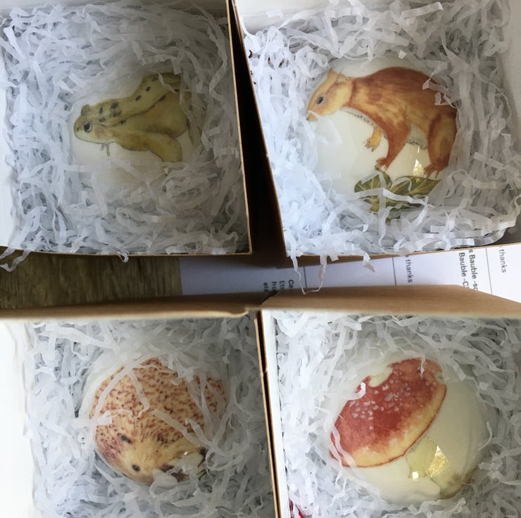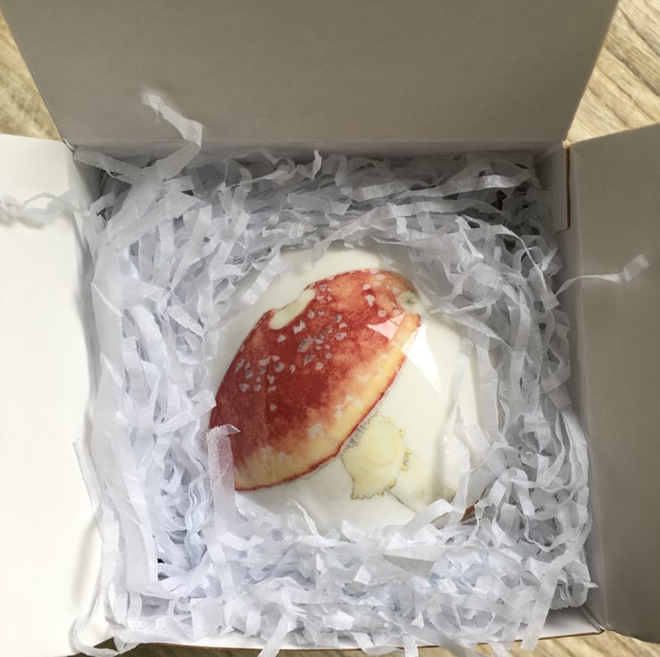 My watercolour paintings of a magical fly agaric toadstool printed as a ceramic transfer and then hand cut and applied to a fine bone china Christmas tree bauble. Each bauble will have a different combination of imagery meaning each one is unique, creating a special heirloom decoration that can be treasured each year.
