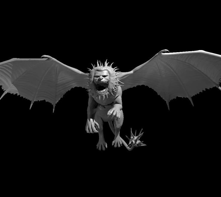 A monster in every sense of the word, a Manticore has a vaguely humanoid head, the body of a lion, and the wings of a dragon. A bristling mane stretches down the creature's back, and its long tail ends in a cluster of deadly spikes that can impale prey at impressive range.