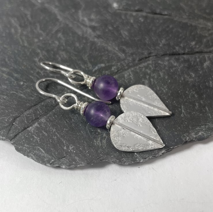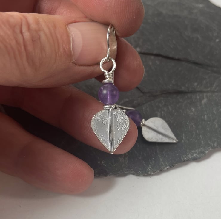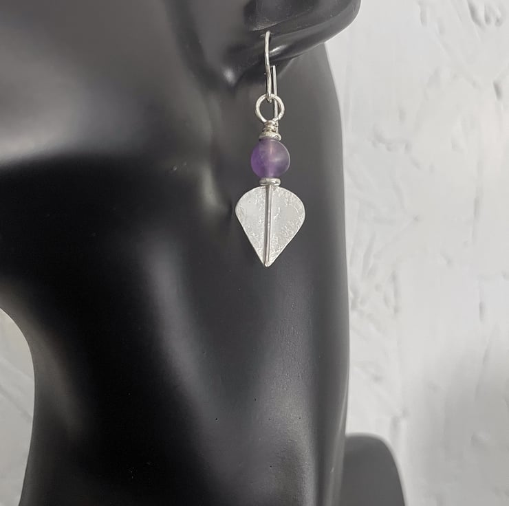 Small lightweight sterling silver and frosted amethyst leaf spear earrings.