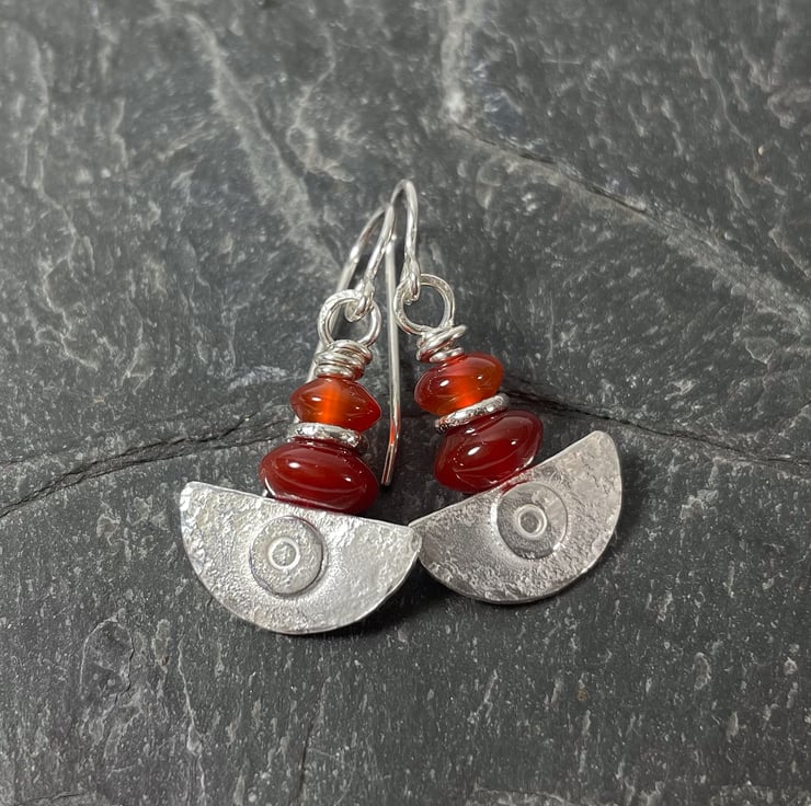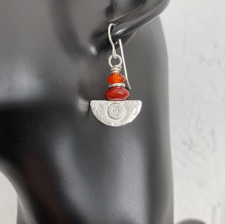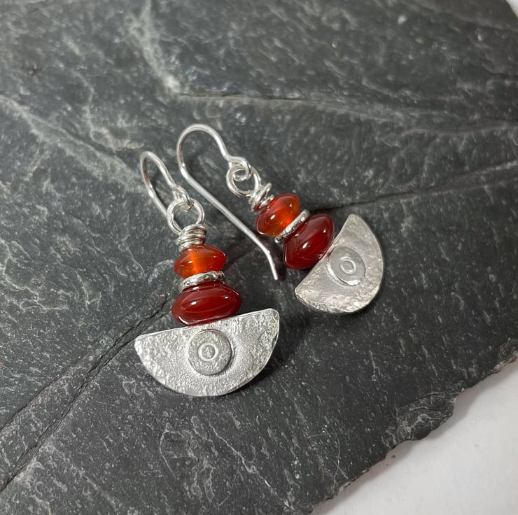 The carnelian beads are in two tones of orange and two sizes, separated by a silver disc bead.
