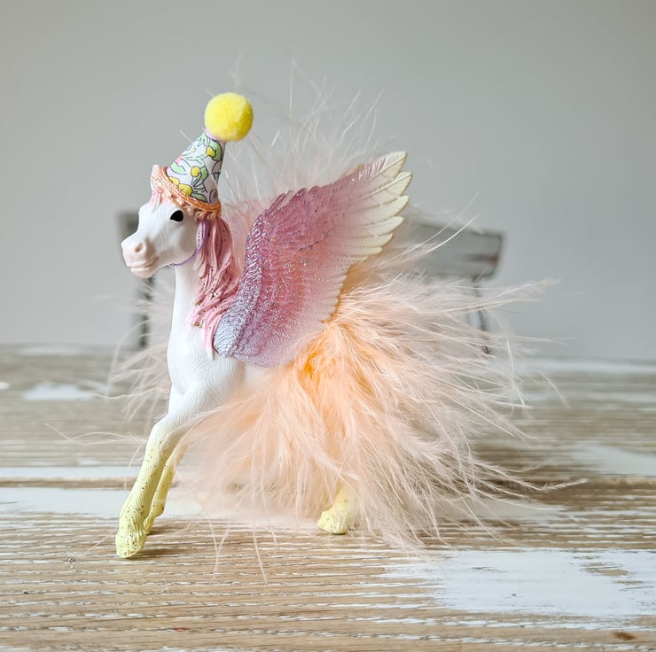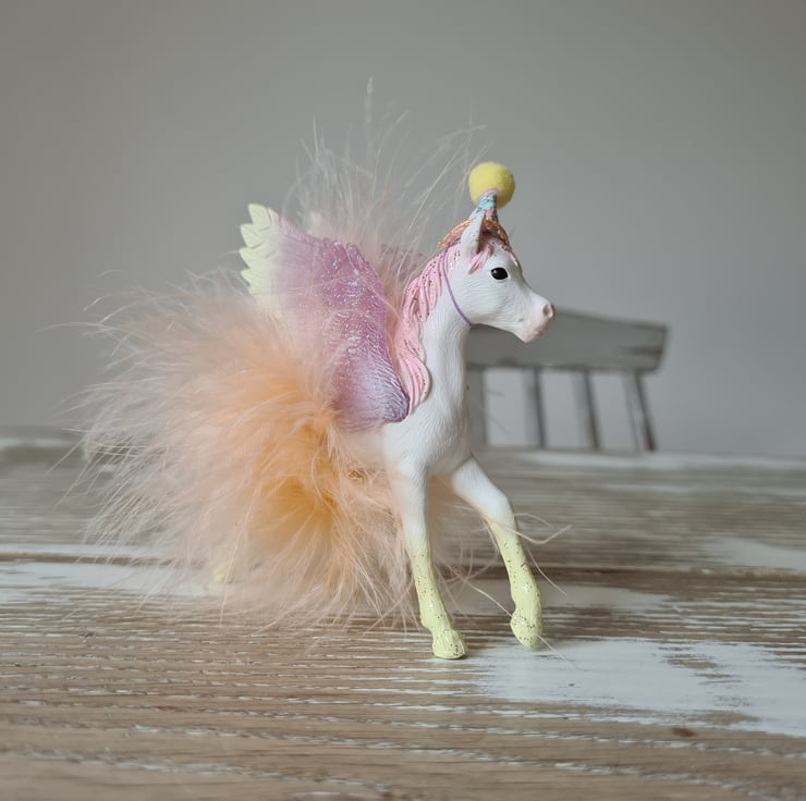 This listing is for one Schleich glittery Pegasus foal. Your pegasus foal will come with a hand made pastel Liberty fabric party hat and pastel peachy/coral feather tutu as pictured!