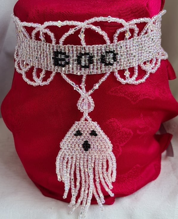 Gorgeous choker necklace perfect for Spooky Season. Made from tiny glass beads that have a milky AB shimmer and shiny Silvery tones with Boo in the middle in Black beads. The dangly ghost to the front is made from the same type of beads. A gorgeous, ornate but Spooky accessory.