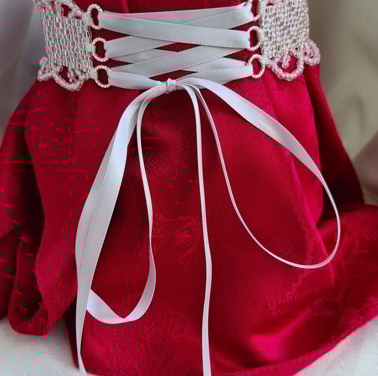 Ribbon to back is approx 120cm long (47.1/2 inches) and is laced through the rings sewn into the back of the necklace. Obviously the ribbon will be longer if your neck is a smaller size or shorter once done up if you have a larger neck.