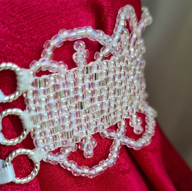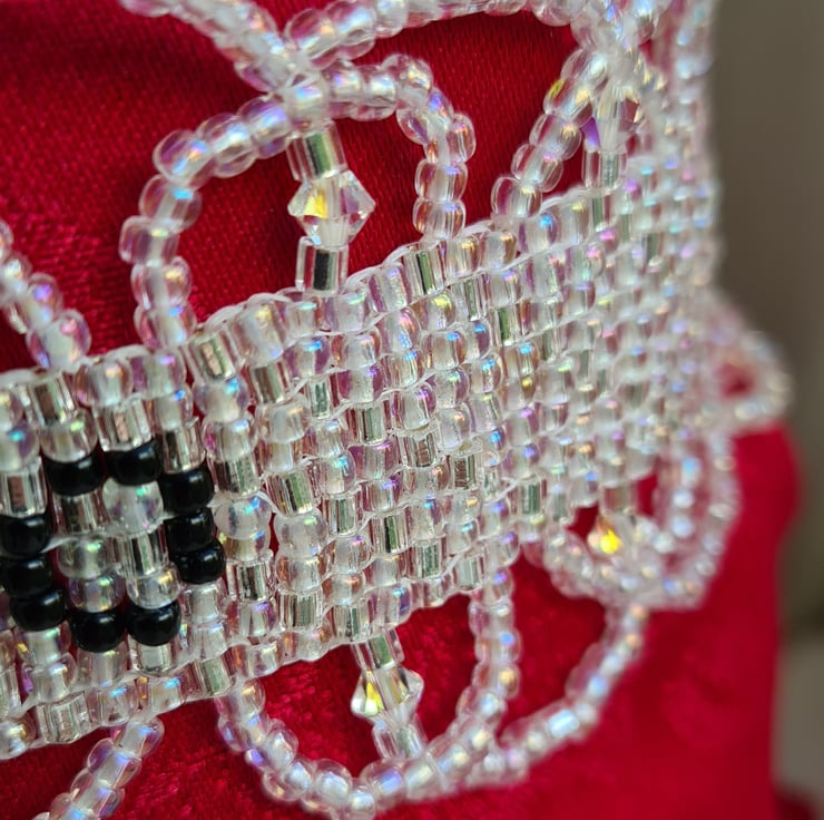This gorgeous choker was definitely a labour of love. It was a new thing I learnt and took me ages to make and nearly 2000 small beads. Gorgeous for a show stopping Spooky statement necklace to glam up Spooky Season. Ribbon is a gorgeous Silvery Satin and makes this necklace re-sizable so you can do it up for a comfortable fit.