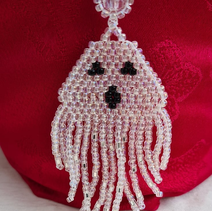 Necklace is a choker style and fastens with a ribbon at the back so it is extendable to a certain degree. Made from tiny 8/0 (3mm) glass beads in AB white, Jet black and hexagonal Silver tubes this necklace is a Spooky one of a kind piece. A total of 1918 beads were used and a lot of time went into making this necklace and dangly ghost.
