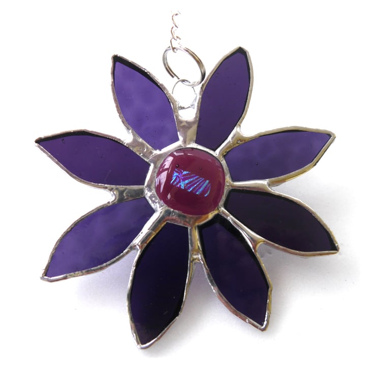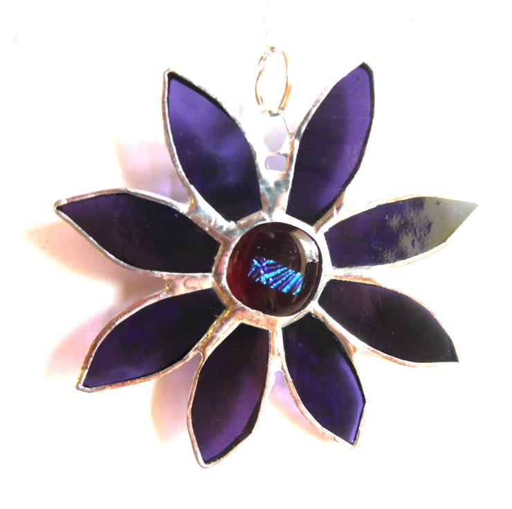 It is a gorgeous bright purple daisy with 8 petals made from 2 different shades and textures of lovely purple glass.