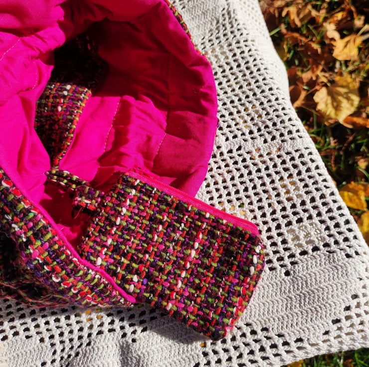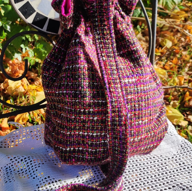There are different bright colours in the fabric: pink, purple, green and white. I chose a hot pink cotton for the lining.