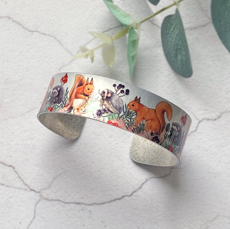 Cuff bracelet with red squirrels and hedgehogs in a nature scene. Handcrafted jewellery, made in the UK. Ideal gift for a wildlife lover. In addition, for a small fee, a personal message can be engraved on the reverse (Optional).