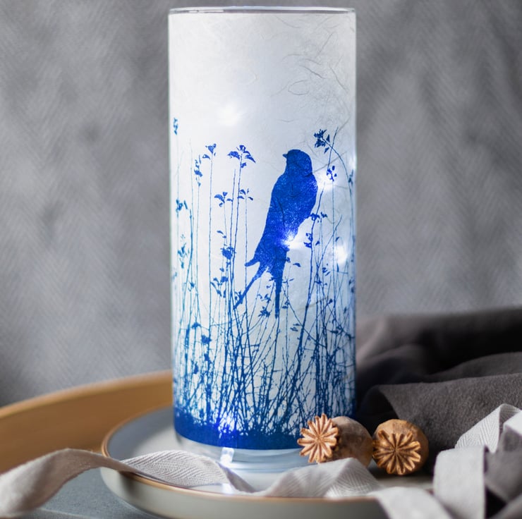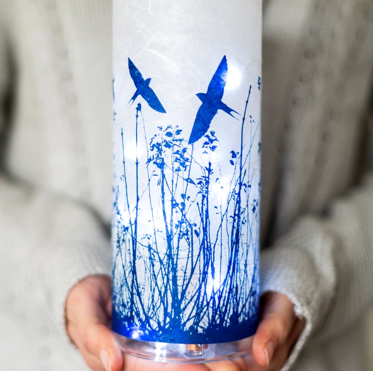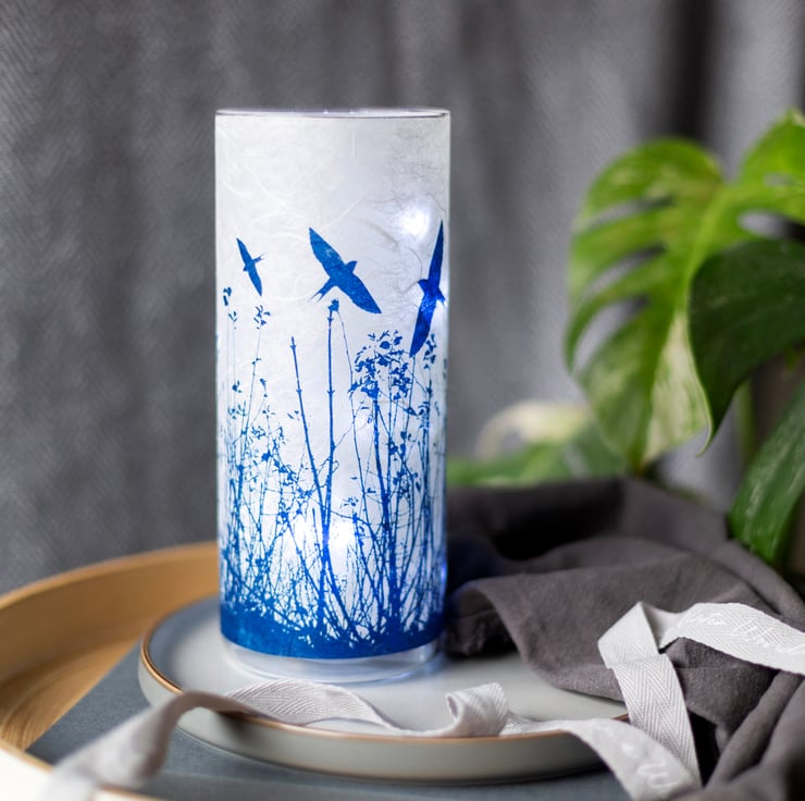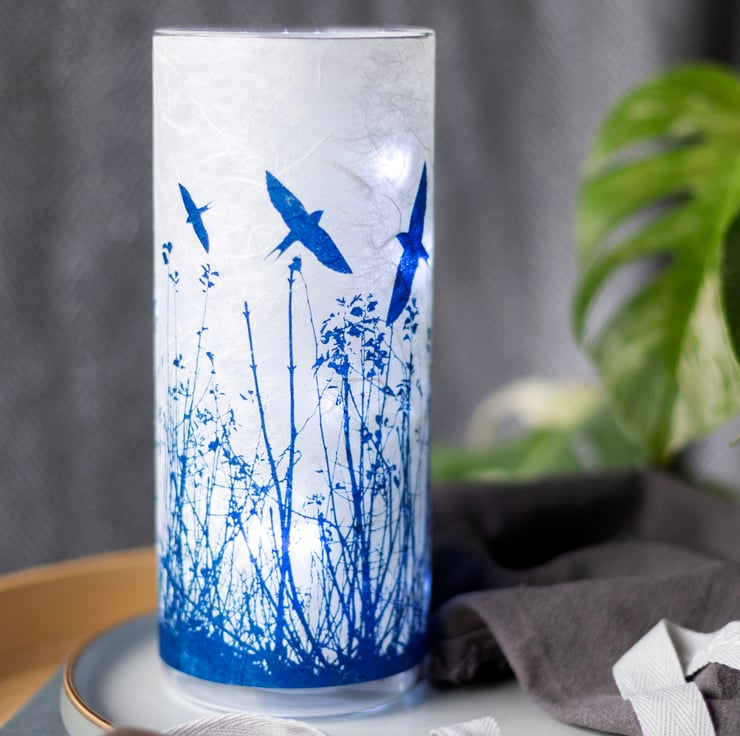 The distinctive silhouette of a Swallow and an intricate blue meadow design is captured on this large decorative vase. The design is created using the Cyanotype technique on a beautifully translucent handmade textured paper which is then applied to glass.