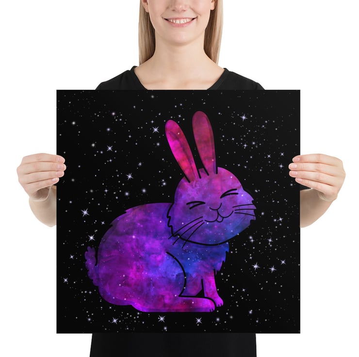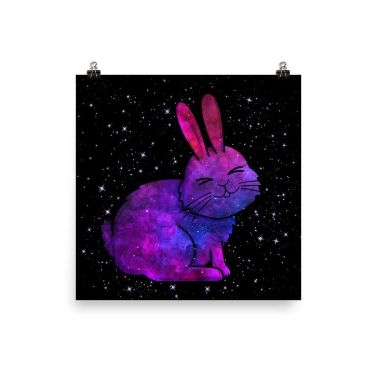 Original digital illustration of a Galaxy bunny, with black background by Jaego Art, printed on-demand.