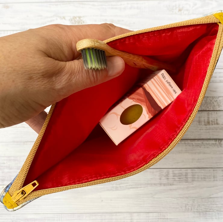The bag measures 22.5 x 17 x 0.5cm approx. The zip opening width is 19cm. All pouches are handmade 100% cotton drill fabric and they are padded. Cleaning instructions: Washable at 30 degrees with similar colours, Do not bleach, Do not wring out, Short spin only, Dry flat, Cool iron, through a cloth, Do not tumble dry, Can be dry cleaned.