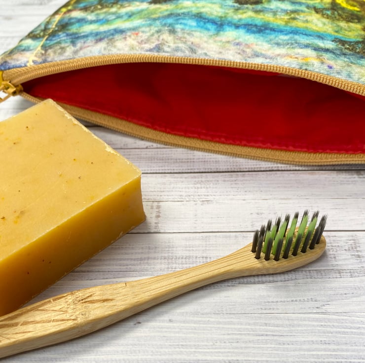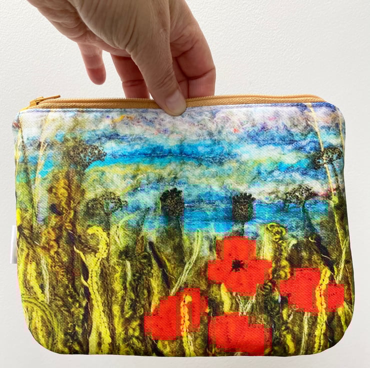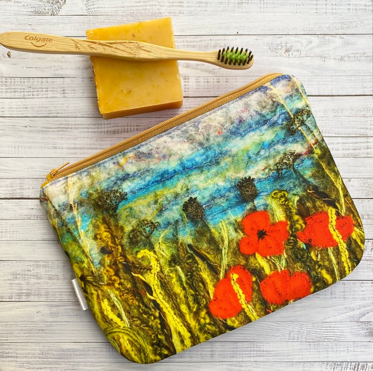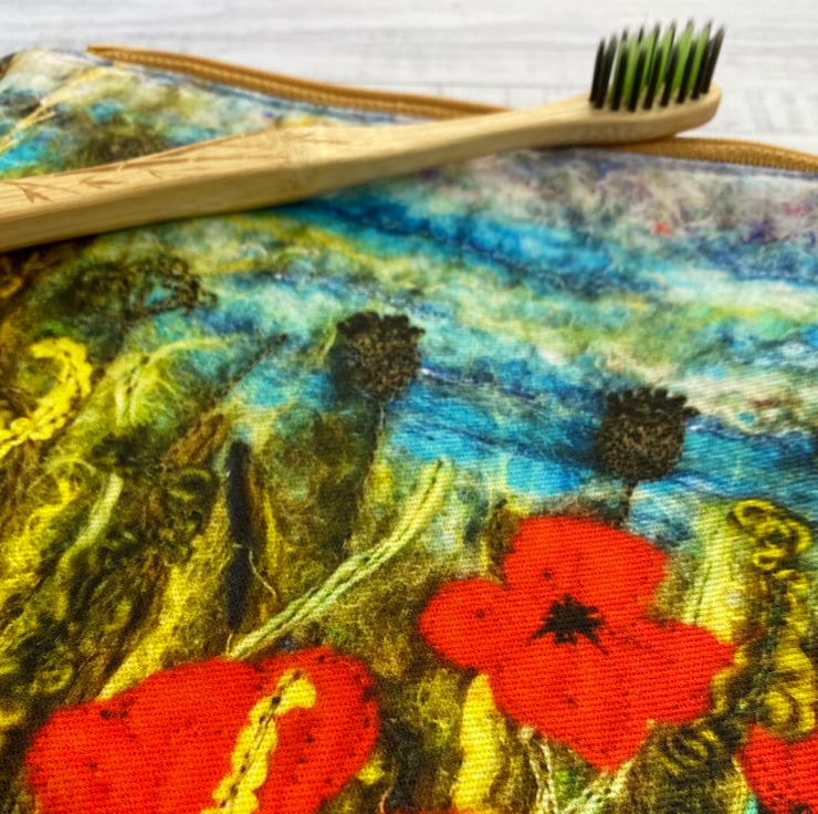 This highly versatile gorgeous zip bag is decorated with a print of one of my embroidered landscapes of Yorkshire. This one shows Saltburn by the Sea through poppies and the grass bank. It’s lined inside with an red water proof lining, and has a matching tan coloured zip. The print is on the front and back.