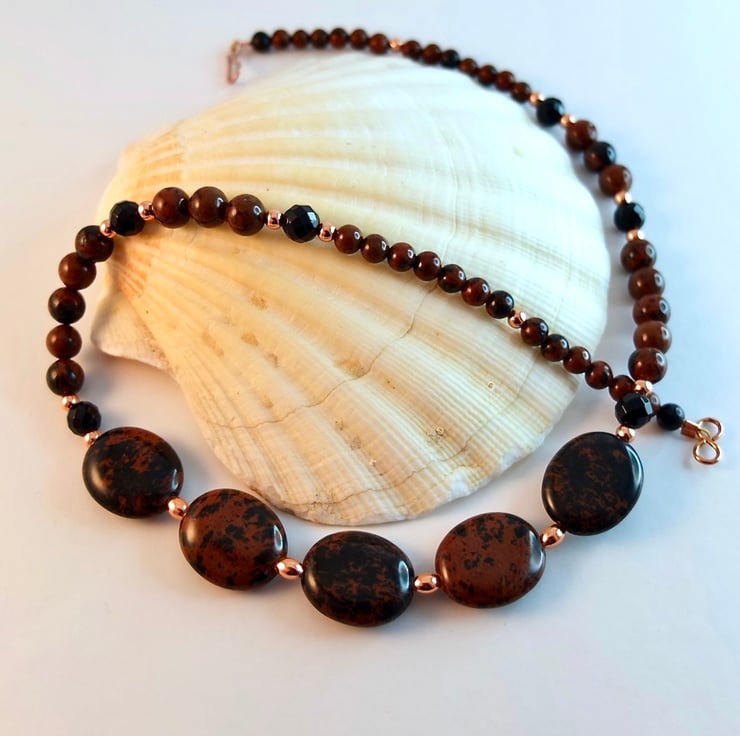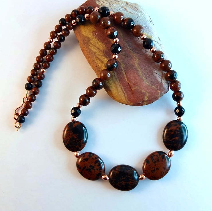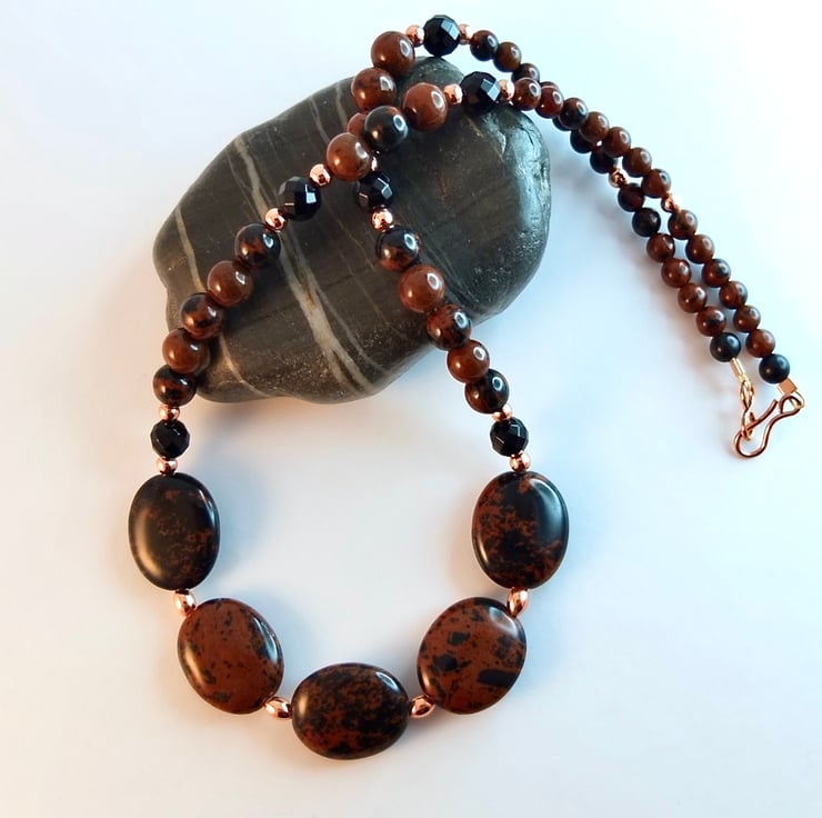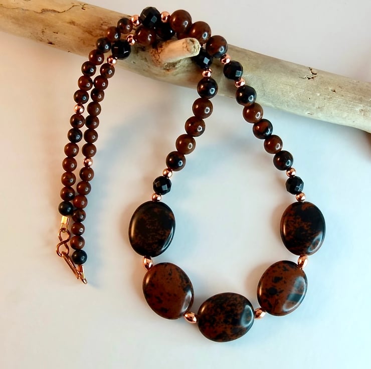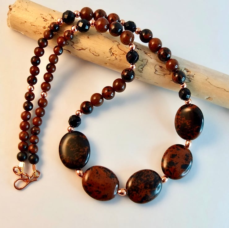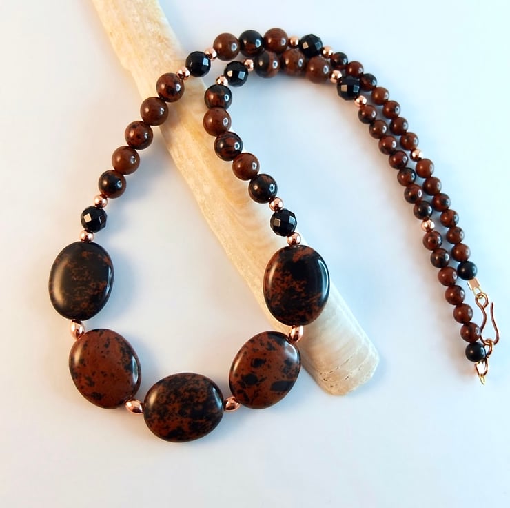 The necklace graduates to 6mm and 4mm Mahogany Obsidian embellished with more Onyx and copper.