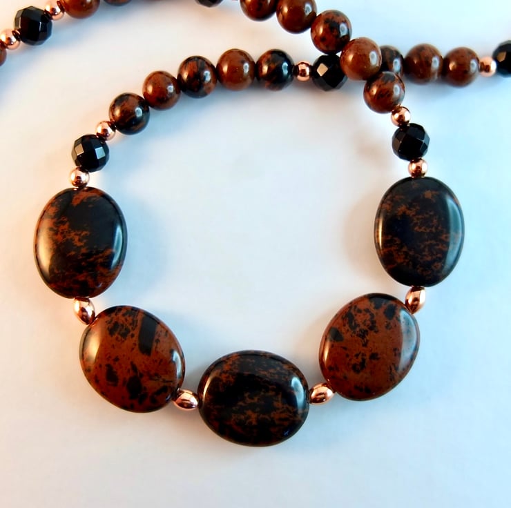 Stylish necklace featuring five 15x18mm oval Mahogany Obsidian beads separated by 5mm copper ovals, flanked by a 6mm faceted black Onyx bead set between 3mm copper rounds.