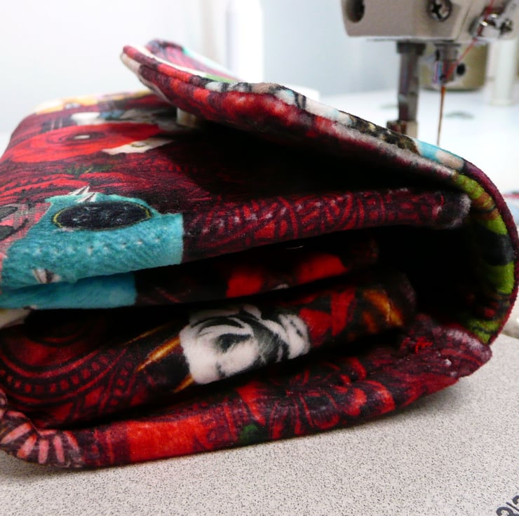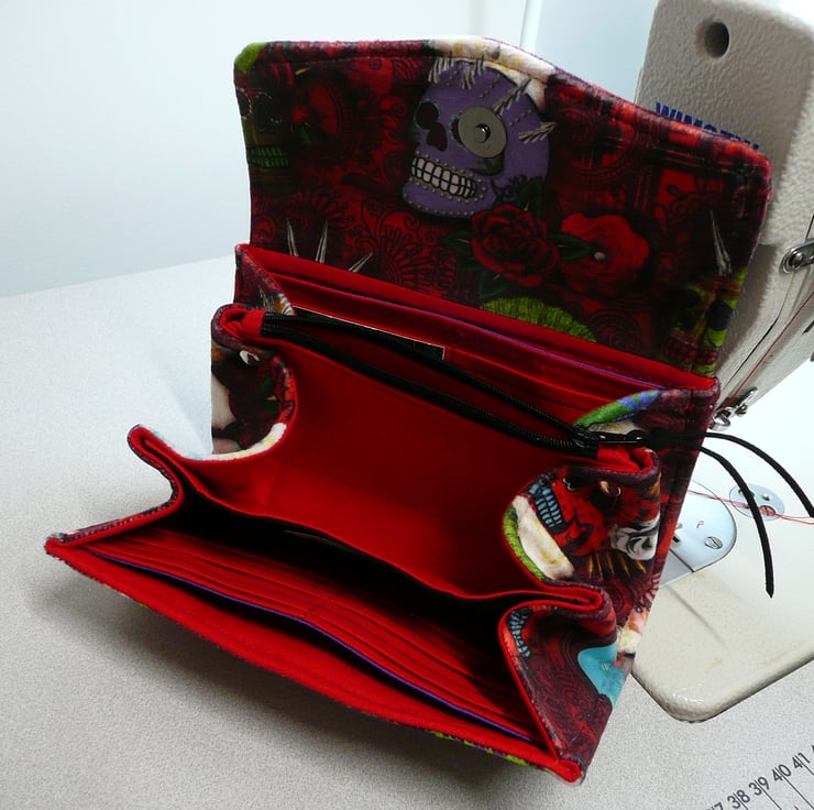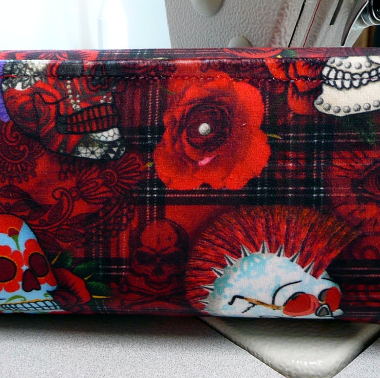 Made from luxery Italian velvet fetauring punk skull characters, this purse has 12 credit card slots, 2 large slots for notes etc and a zipper section for small change, all finished off with a magnetic snap fastener and silver nickel rivets on the sides.