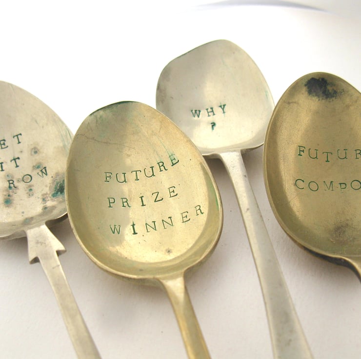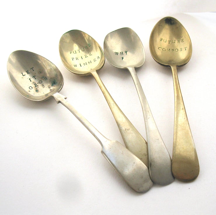 Here is a perfect gift to make a gardener smile: a set of four battered old dessertspoons handstamped for use as plant labels. They say LET IT GROW, FUTURE PRIZE WINNER, FUTURE COMPOST and a plaintive WHY?