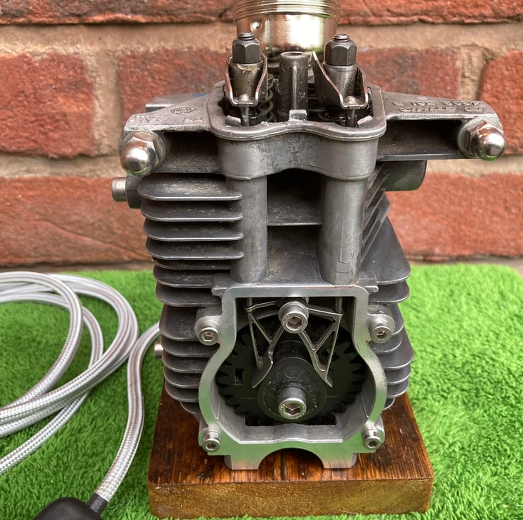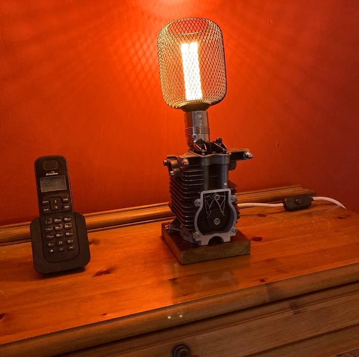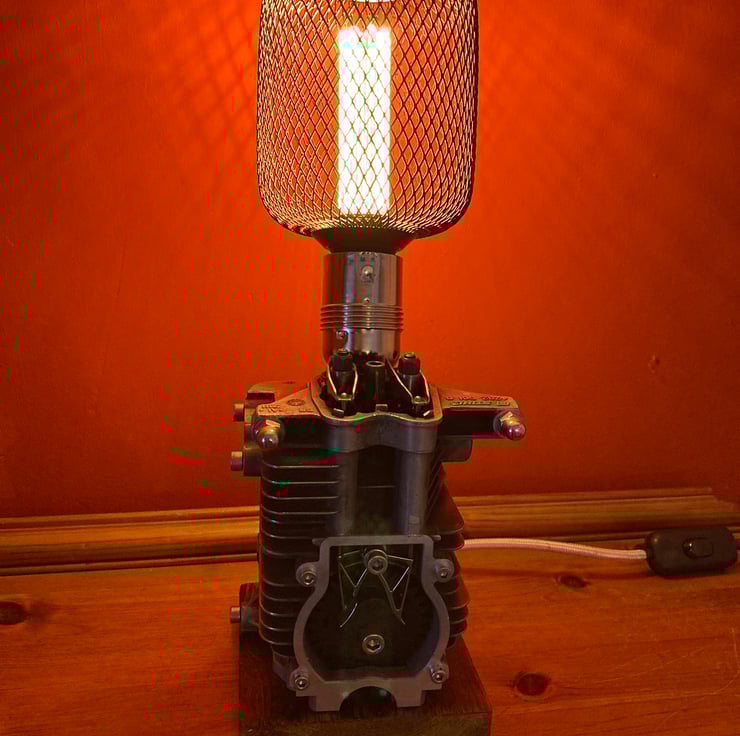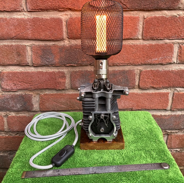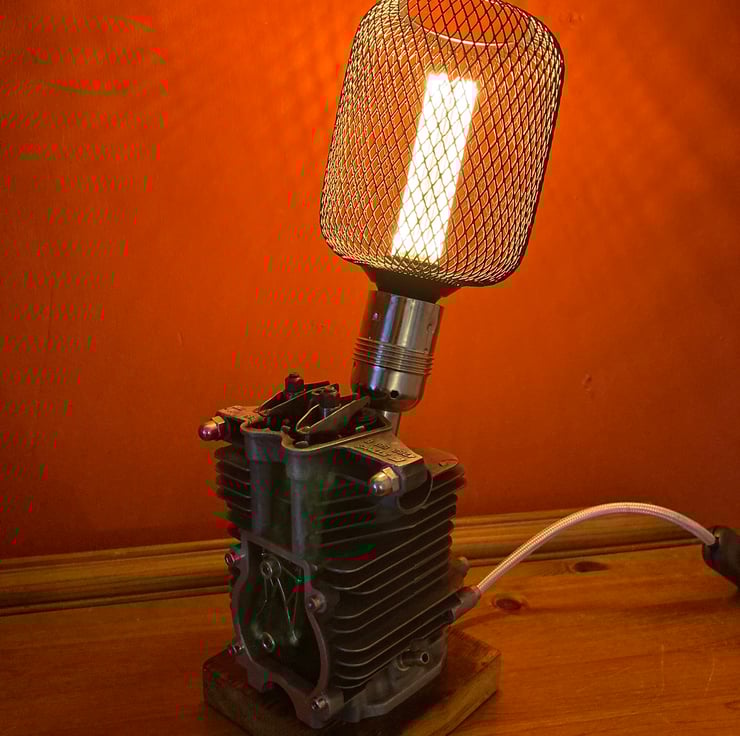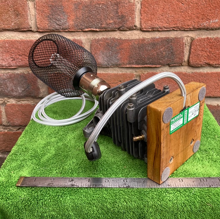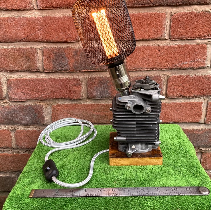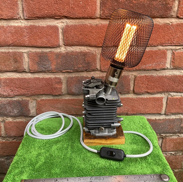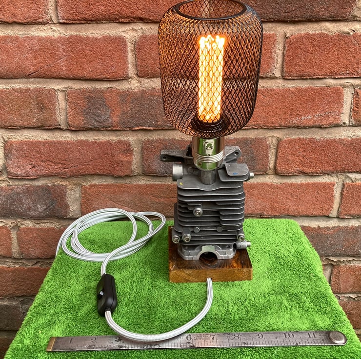 The cylinder, from a commercial grade ‘backpack’ leaf blower by a well-respected German manufacturer has the covers for the valve rockers and cam left off for interest. It has been cleaned and mounted on a reclaimed wood base which I’ve lightly sanded to preserve the patina and French polished. I’ve fitted a nickel-plated Edison screw (ES, E27) lampholder in the spark plug port with a very decorative and well suited 4-watt LED mesh caged bulb. Power is supplied through 2.5 metres of decorative, braided silver flex with a black inline switch and black 3 pin plug.