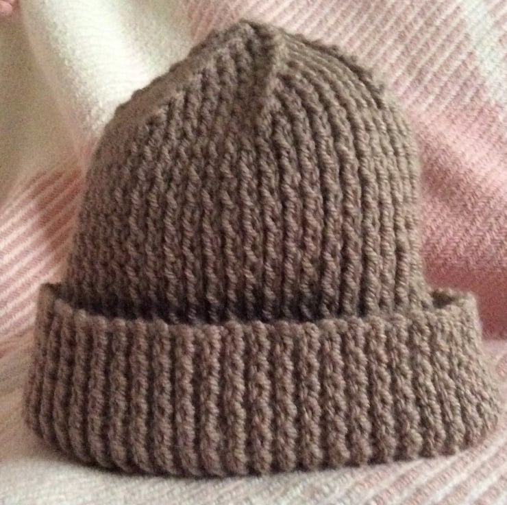 Adult hat hand knitted in a brown colour acrylic yarn.