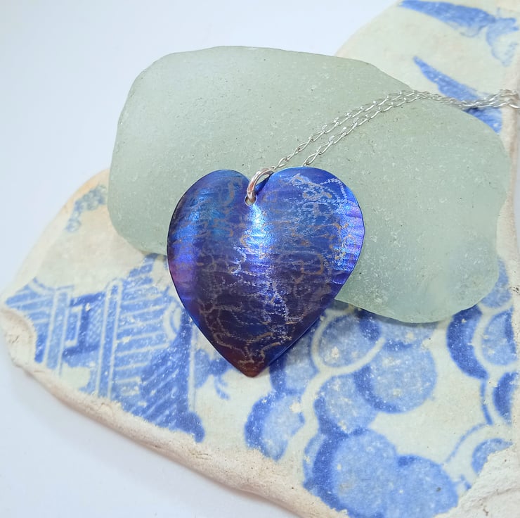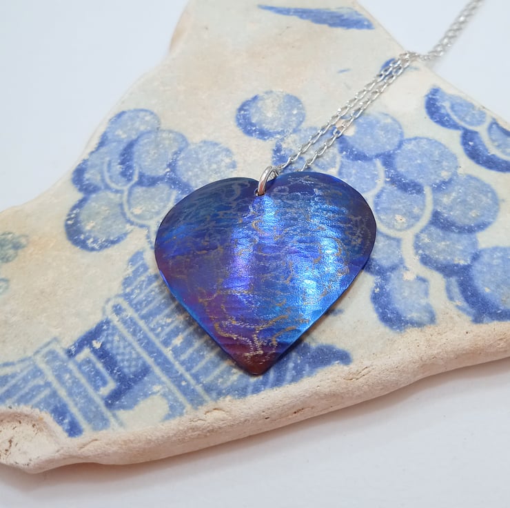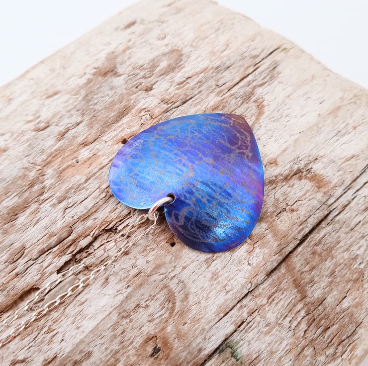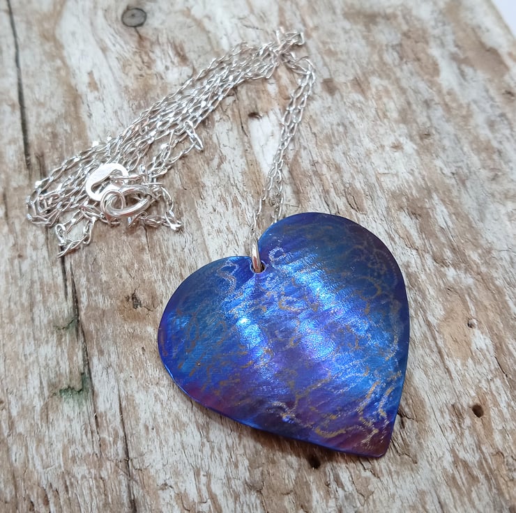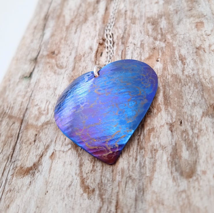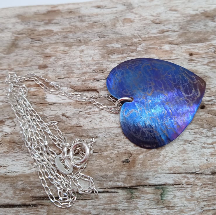 This titanium pendant necklace displays a range of attractive shades which really come to life when it catches the light.