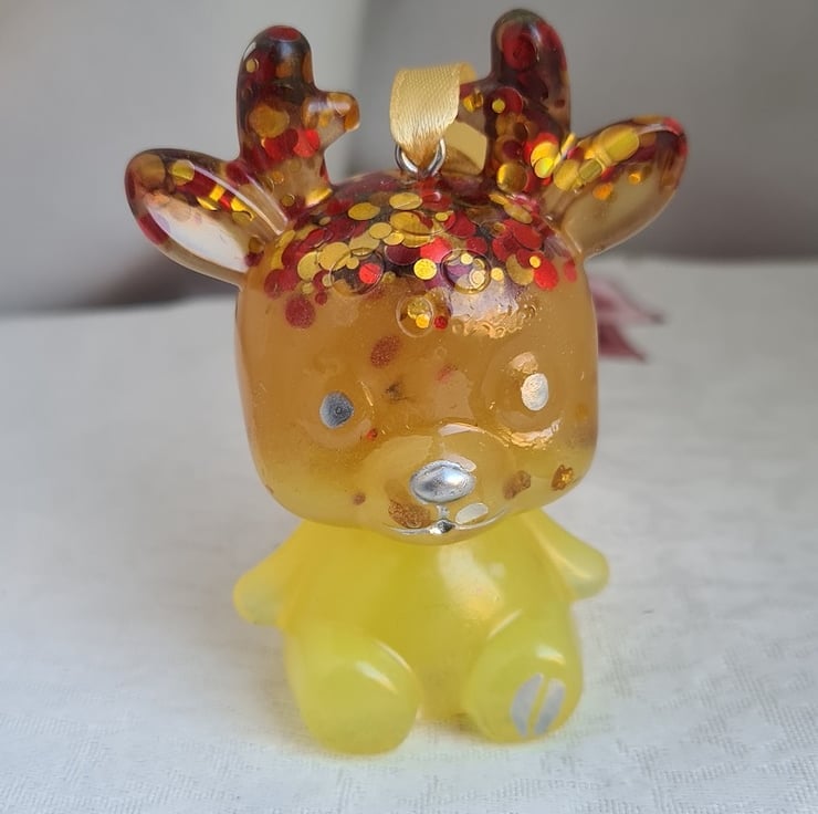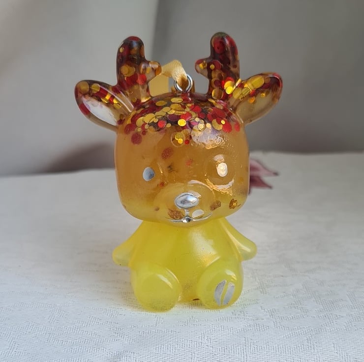 A lovely little 3D Reindeer is just perfect for hanging on your tree. This cute orange tone resin figurine is just the sweetest decoration with a glittery head and antlers. It hangs on a Gold satin ribbon so can be hung anywhere. Great as a Christmas gift.