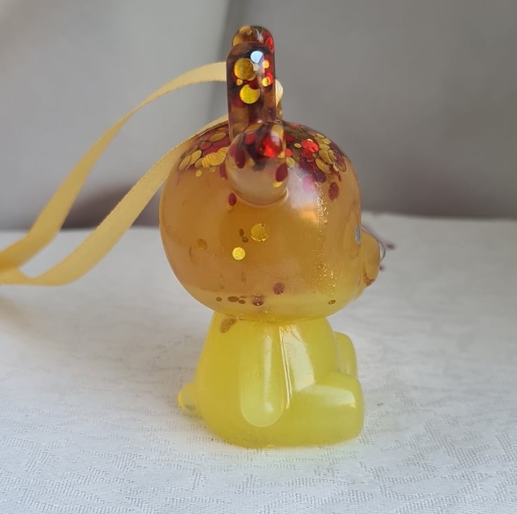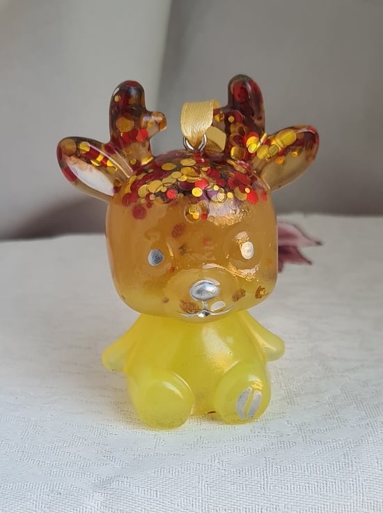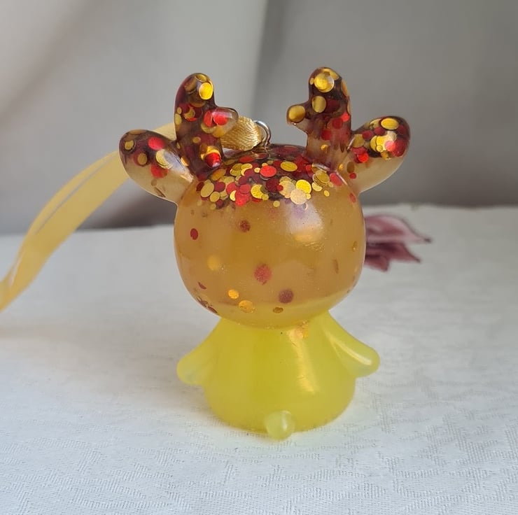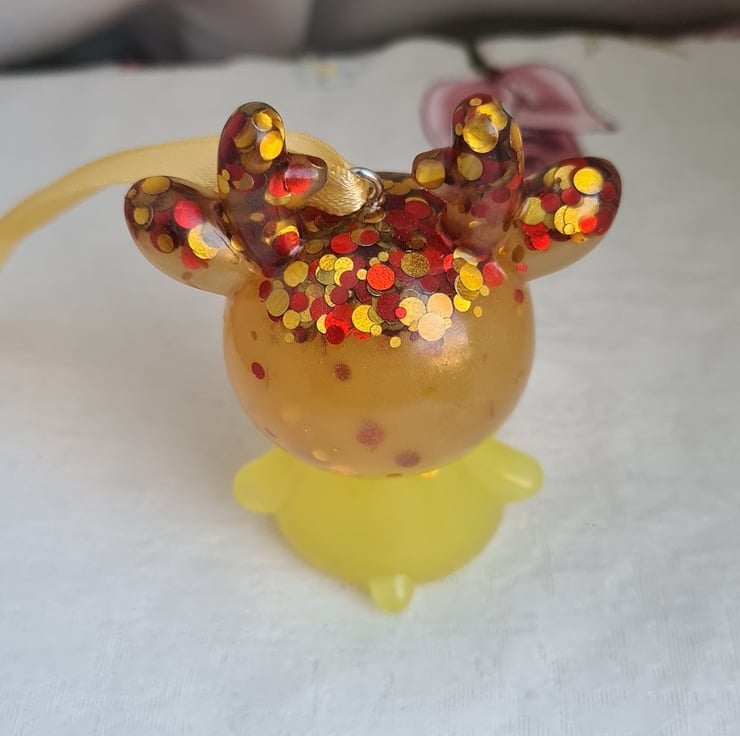 Reindeer Height is approx 7cm high, 5.5cm at widest part. Ribbon is approx 11cm long from the top of Reindeer's head to the bottom of the knot and is a light Gold colour satin. It is made of Orange tone resin (The face is a darker orange than the body) and chunky Red and Gold glitter adorning the top of the head and antlers.