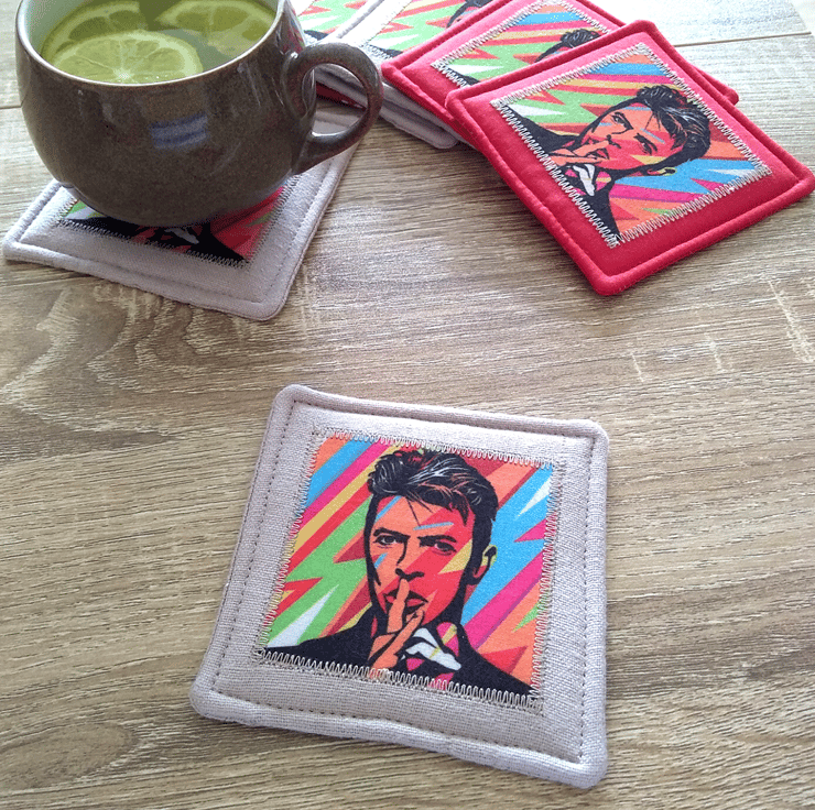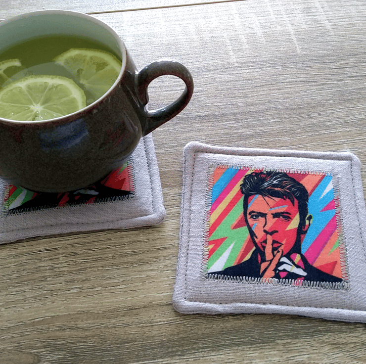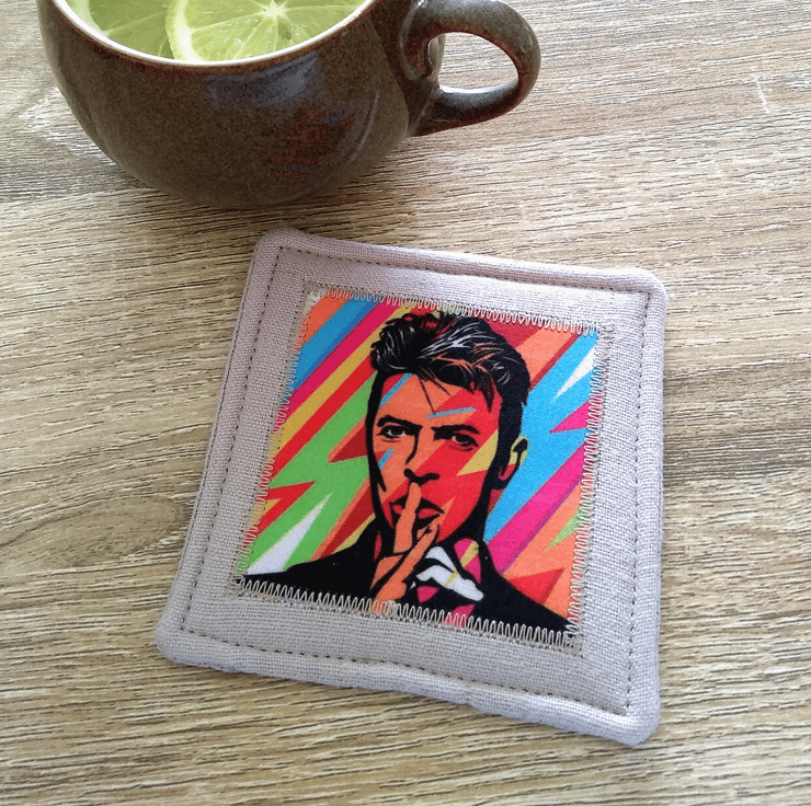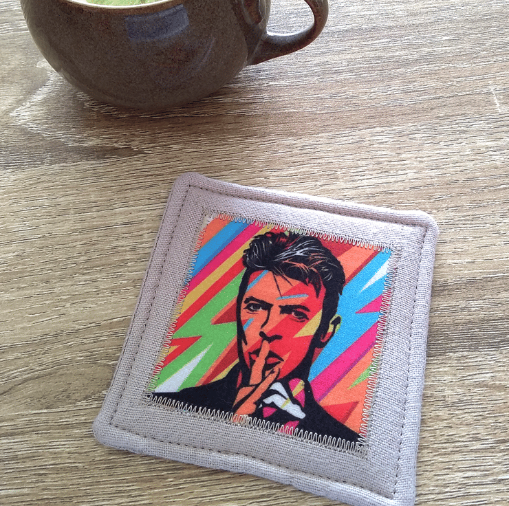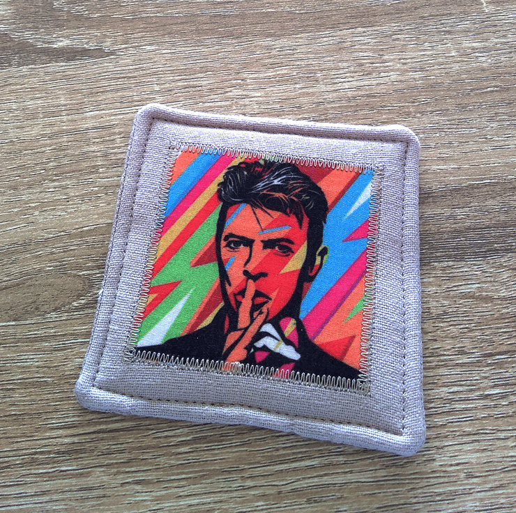 This stylish, fabric coaster will brighten any table and delight a David Bowie fan whilst they are drinking a cup of tea! The colourful image of the musical legend is appliquéd onto the front of the coaster. The back is plain taupe/beige.