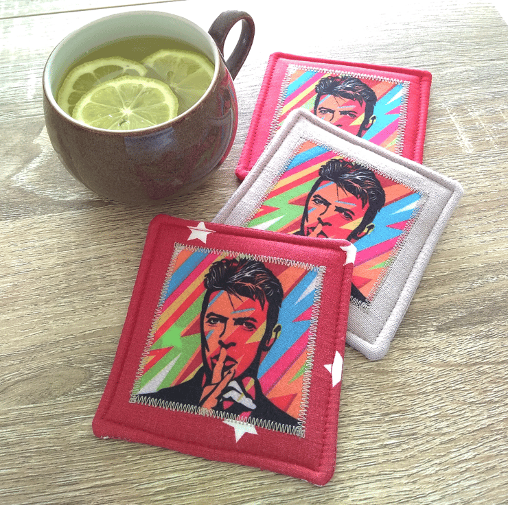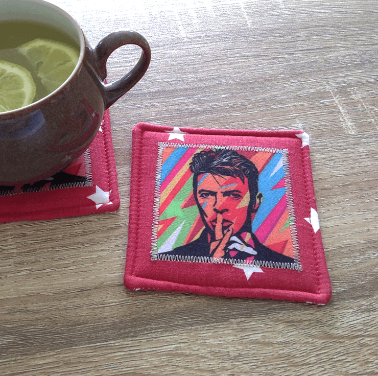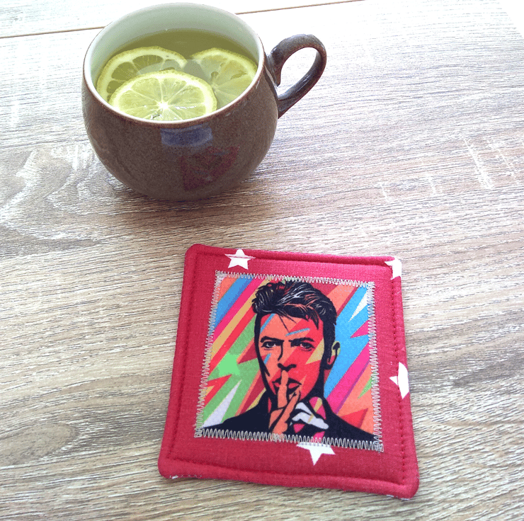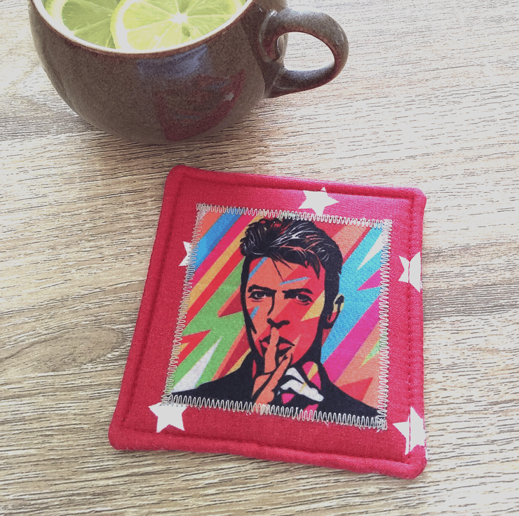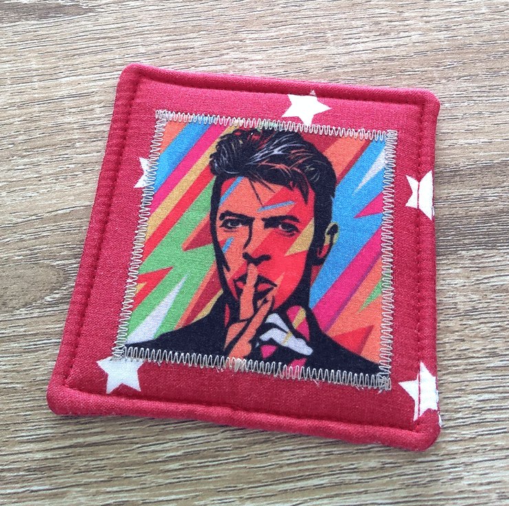 This fabulous fabric coaster will brighten any table and cheer a David Bowie fan whilst they are having a cup of coffee! The colourful image of the musical legend is appliquéd onto the front of the coaster only. The main fabric is red with white stars – appropriate as Mr Bowie was a starman!