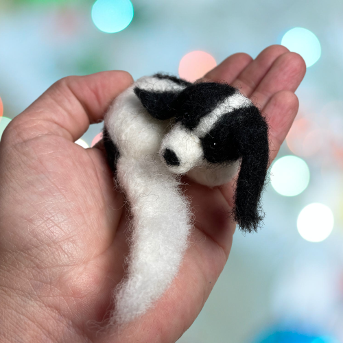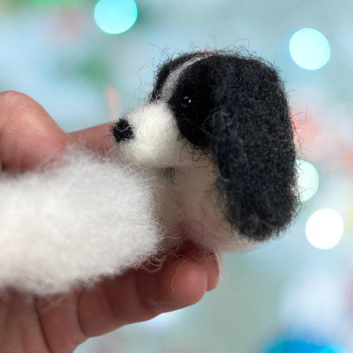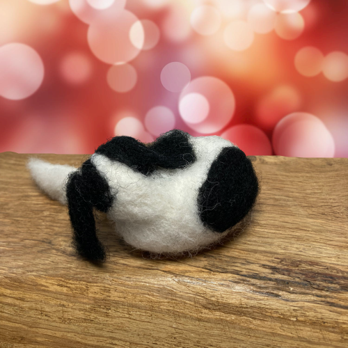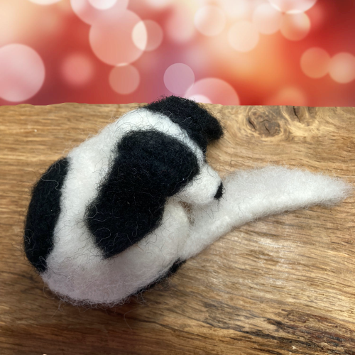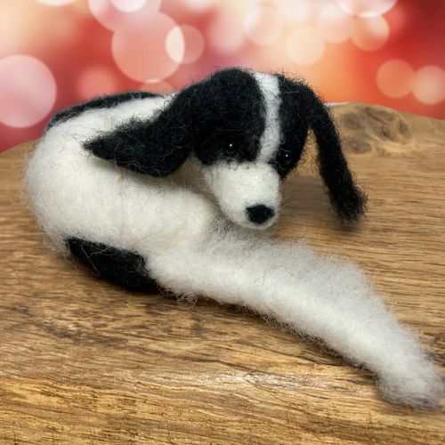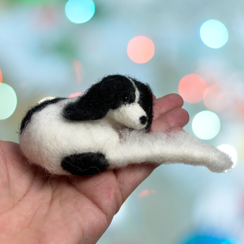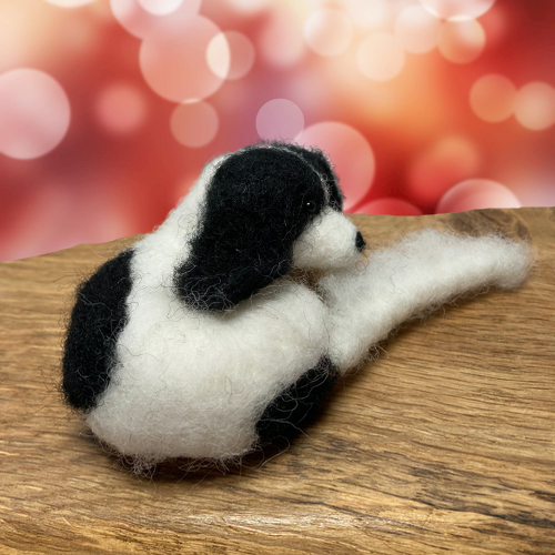 Who can resist a cute little spaniel? This needle felted model of a black and white spaniel has been sculpted from woollen fibres using a barbed felting needle. With beaded eyes and a fluffy tail this dog is posed in a curled up position. The model measures just 10cm (4") x 5cm (2") and fits in the palm of your hand.