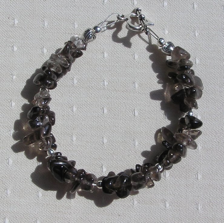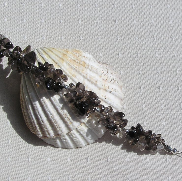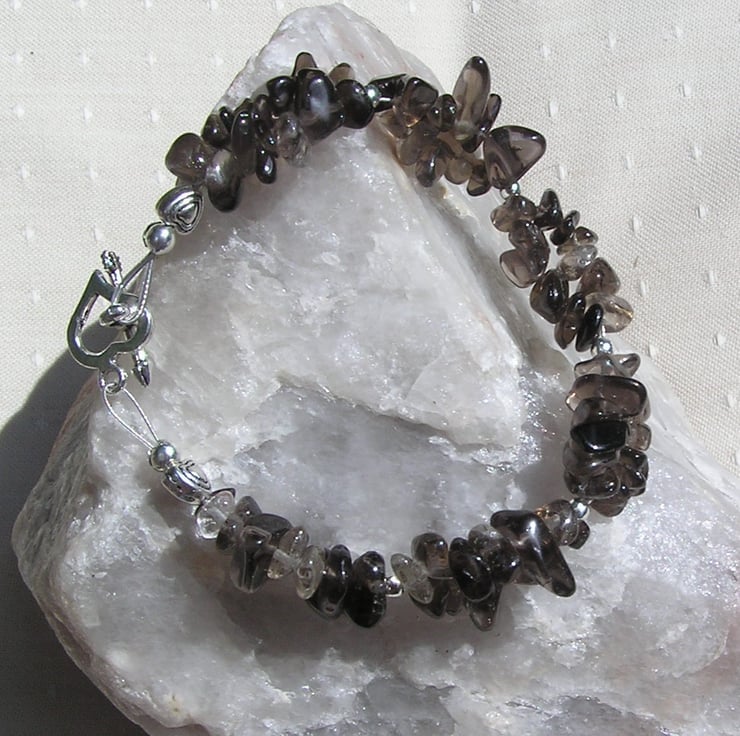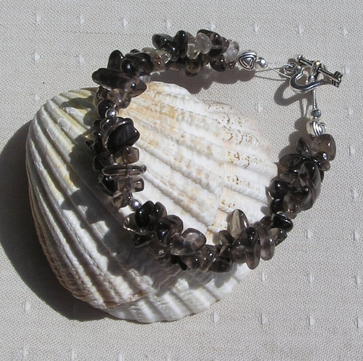 This Stunning Bracelet is made wholly from Smoky Quartz – Double stranded Gem chips separated into short sections by Silver spacer beads with a further tiny Silver Heart at each end - A Glistening combination