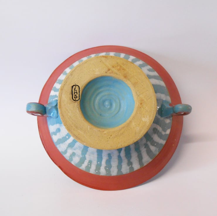 It has been made with sandy clay, and glazed with a Satin blue glaze, there are striped areas on the red, white and Blue glazes.
