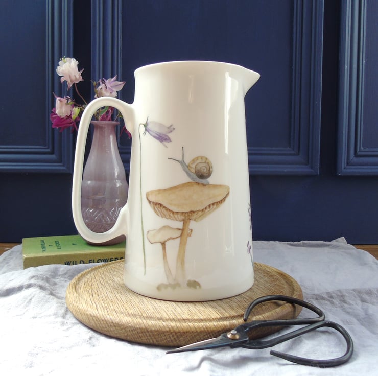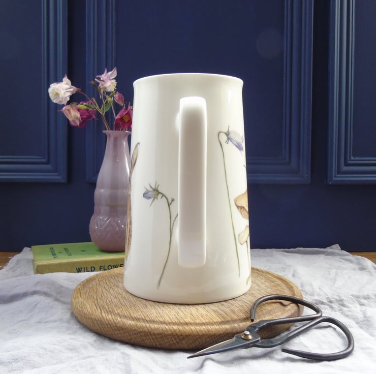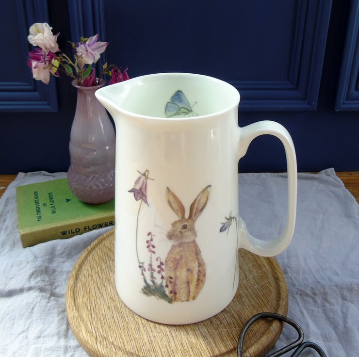 Hand decorated using ceramic transfers of my watercolour paintings of a brown hare amongst the flora and fauna inspired by my walks in the Northumbrian moors. My illustrations are professionally printed onto ceramic transfers then cut and applied to the jugs by hand, making each one special and unique.