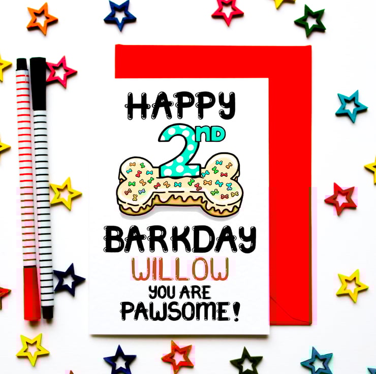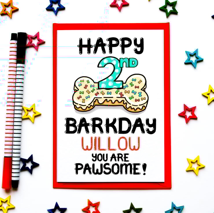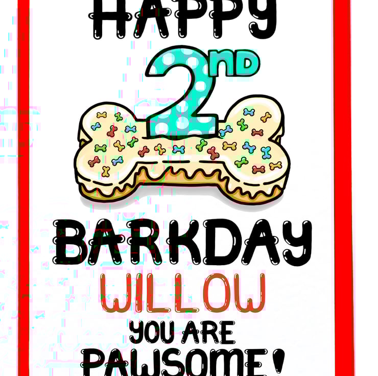 Greeting on front: HAPPY 2ND BIRTHDAY (NAME) YOU ARE PAWSOME!