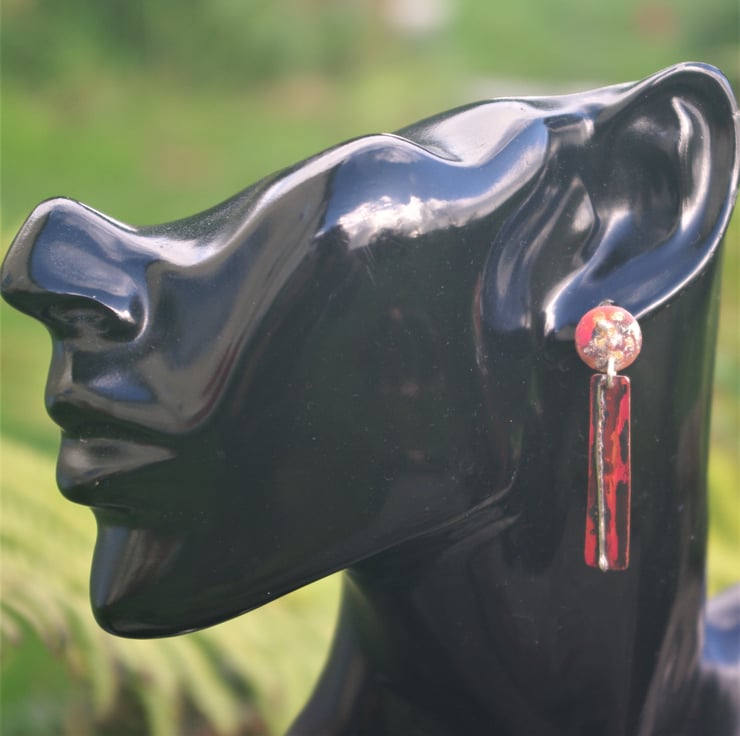 The deep red tones on both parts of the earring are achieved with heat and preserved with wax. The circles sit neatly on the earlobe with a stud fastening .