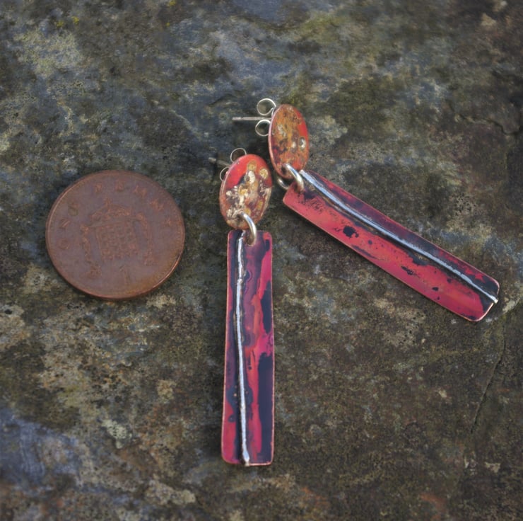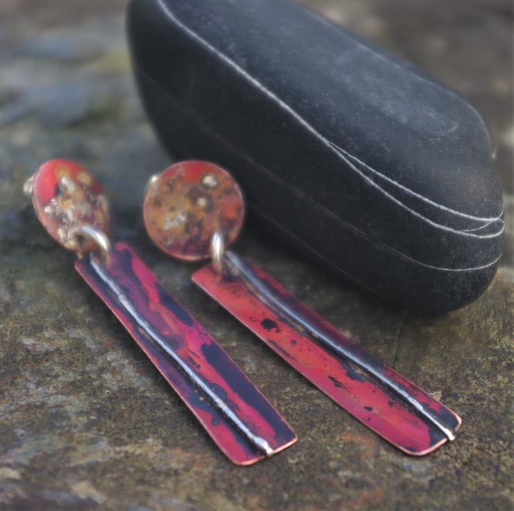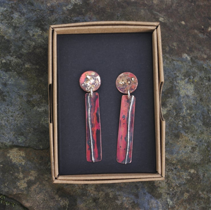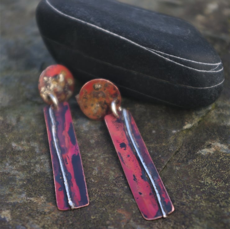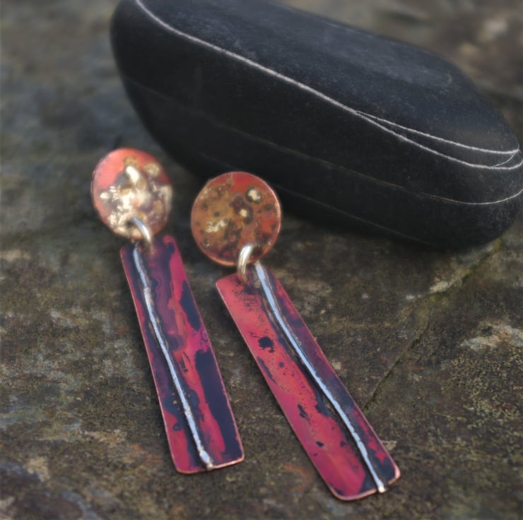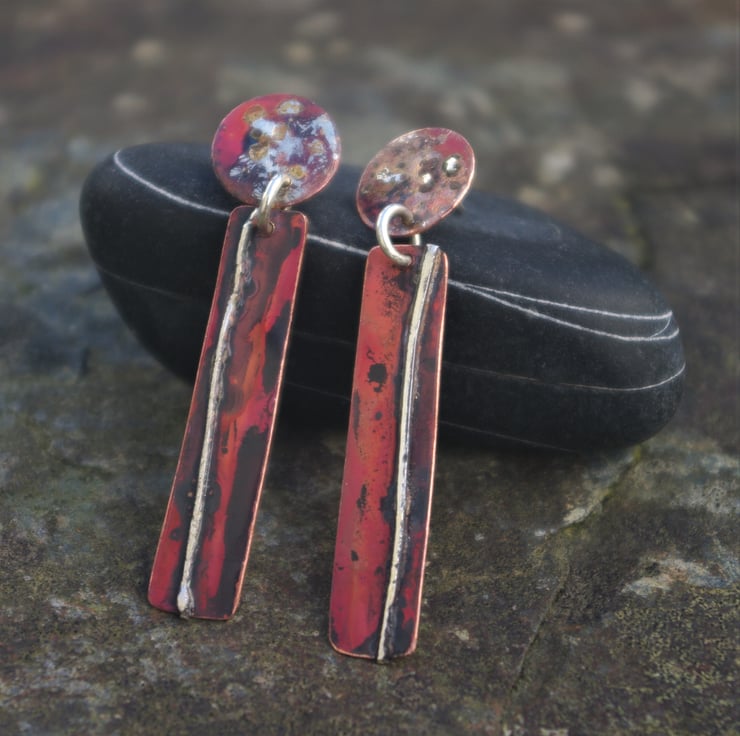 Copper dangle earrings with a stripe of sterling silver wire; inspired by the amazing strata on the cliffs of the coast where I live in West Wales and the reminders in the stripy pebbles on the beach that I am always drawn to . Put together with copper circles ; also inspired by the textures seen on coastal rocks and achieved with left over silver dust .